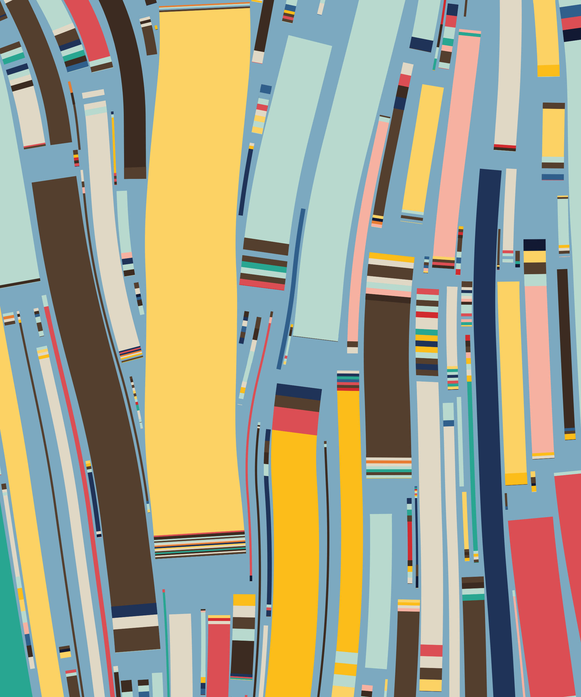 Fidenza is by far my most versatile algorithm to date. Although the program stays focused on structured curves and blocks, the varieties of scale, organization, texture, and color usage it can employ create a wide array of generative possibilities.