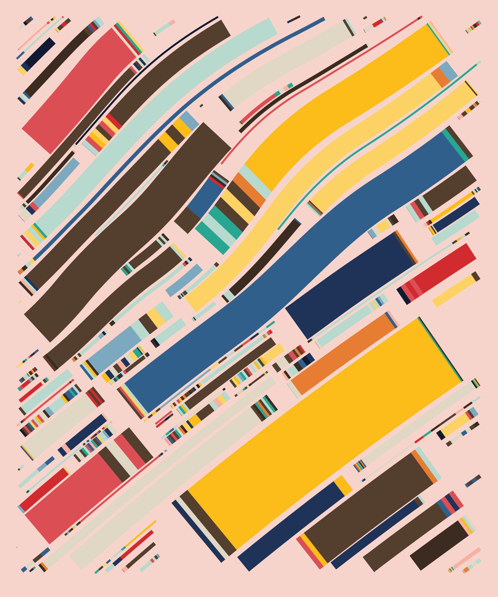 Fidenza is by far my most versatile algorithm to date. Although the program stays focused on structured curves and blocks, the varieties of scale, organization, texture, and color usage it can employ create a wide array of generative possibilities.
