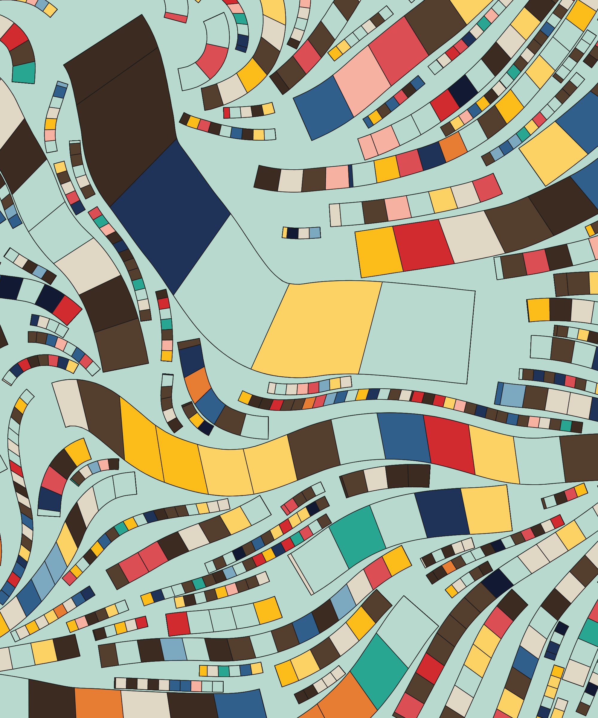 Fidenza is by far my most versatile algorithm to date. Although the program stays focused on structured curves and blocks, the varieties of scale, organization, texture, and color usage it can employ create a wide array of generative possibilities.