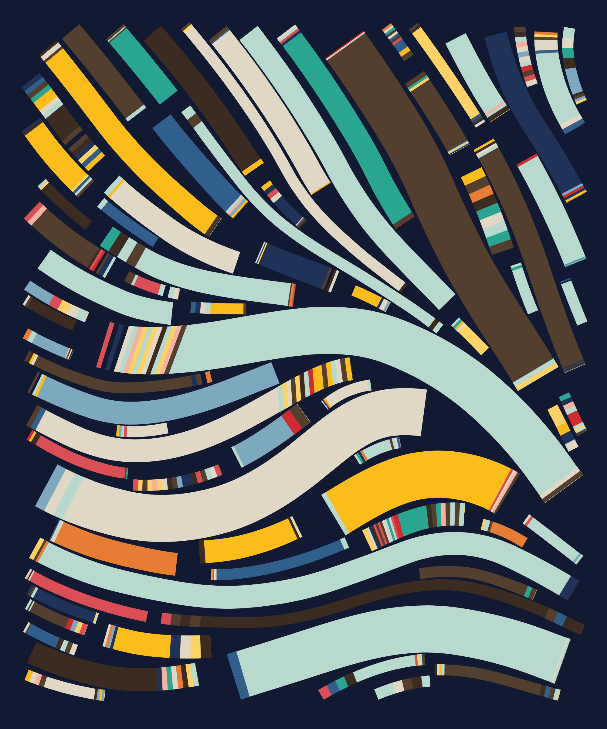 Fidenza is by far my most versatile algorithm to date. Although the program stays focused on structured curves and blocks, the varieties of scale, organization, texture, and color usage it can employ create a wide array of generative possibilities.