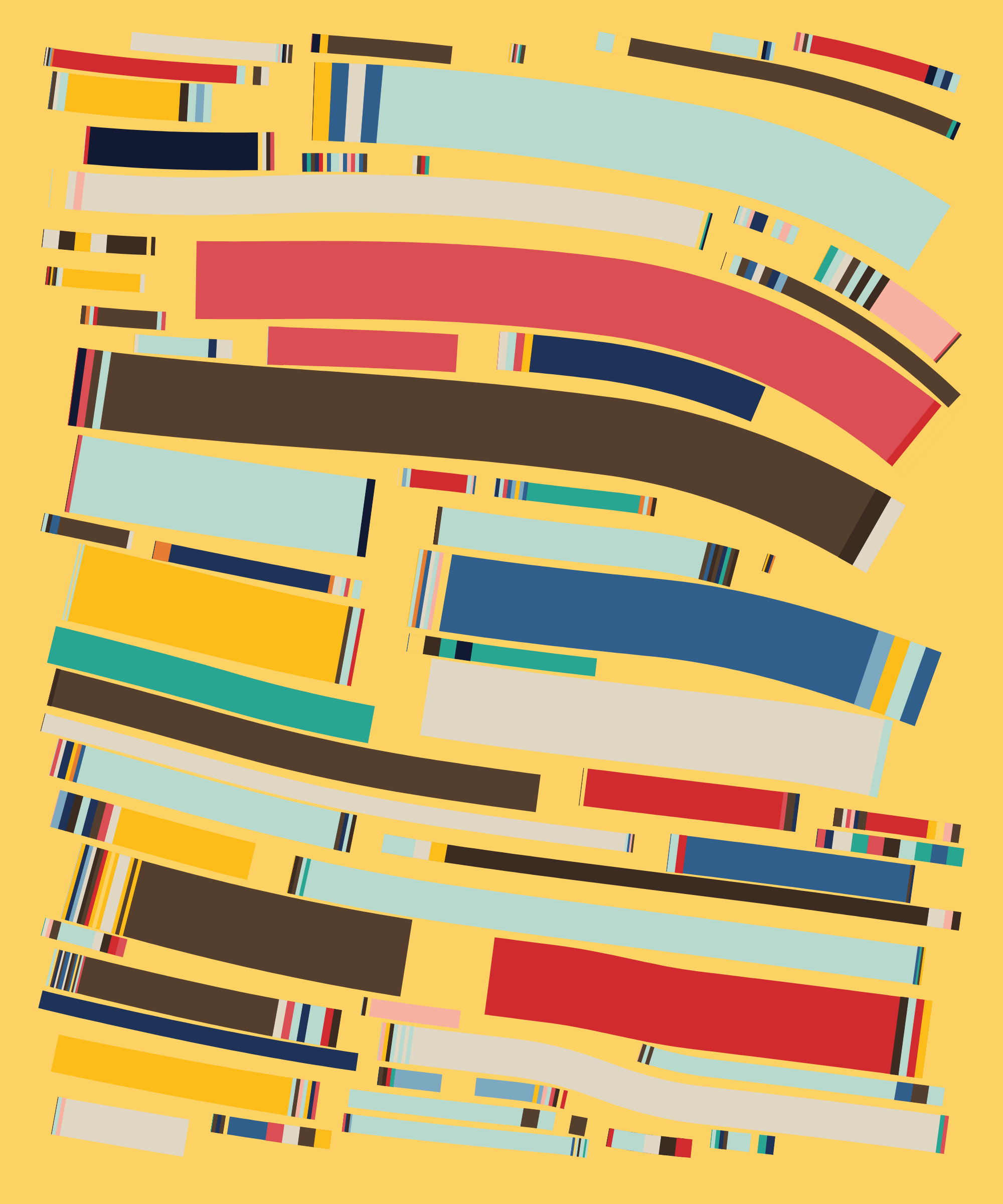 Fidenza is by far my most versatile algorithm to date. Although the program stays focused on structured curves and blocks, the varieties of scale, organization, texture, and color usage it can employ create a wide array of generative possibilities.
