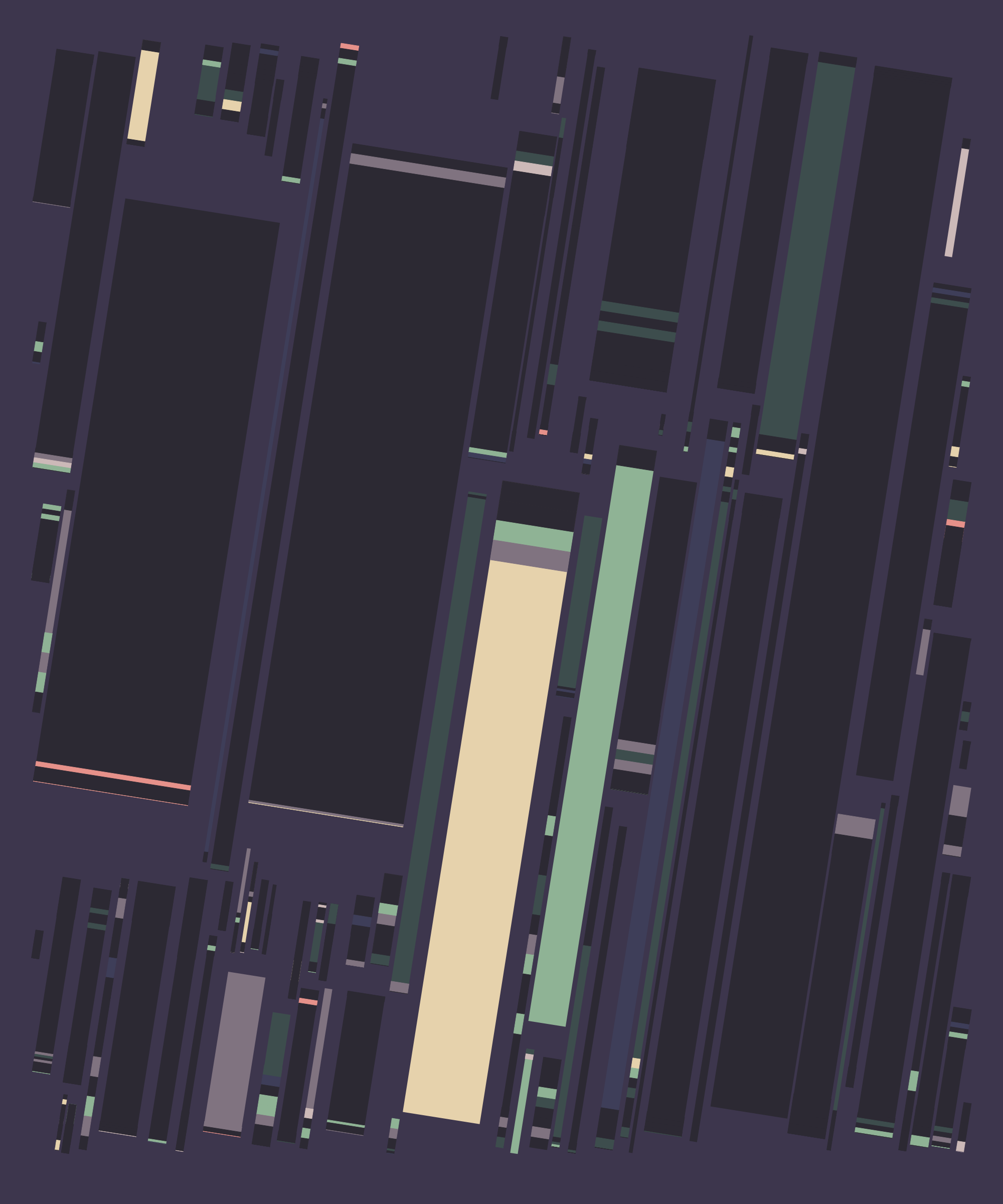Fidenza is by far my most versatile algorithm to date. Although the program stays focused on structured curves and blocks, the varieties of scale, organization, texture, and color usage it can employ create a wide array of generative possibilities.