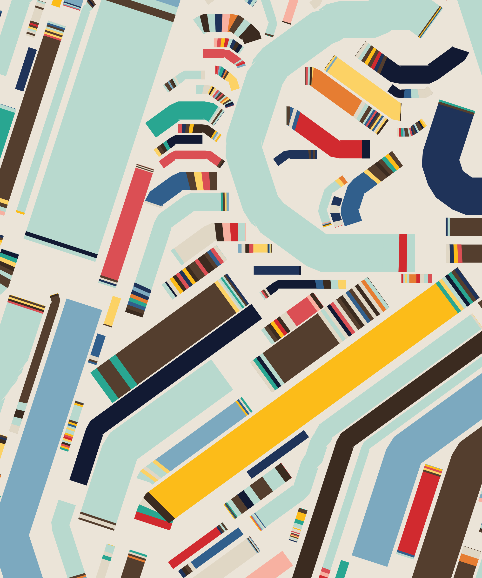 Fidenza is by far my most versatile algorithm to date. Although the program stays focused on structured curves and blocks, the varieties of scale, organization, texture, and color usage it can employ create a wide array of generative possibilities.