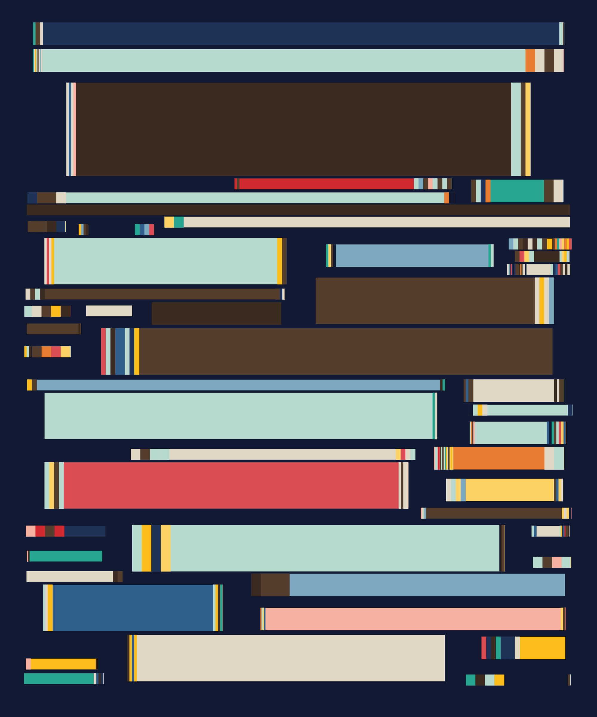 Fidenza is by far my most versatile algorithm to date. Although the program stays focused on structured curves and blocks, the varieties of scale, organization, texture, and color usage it can employ create a wide array of generative possibilities.