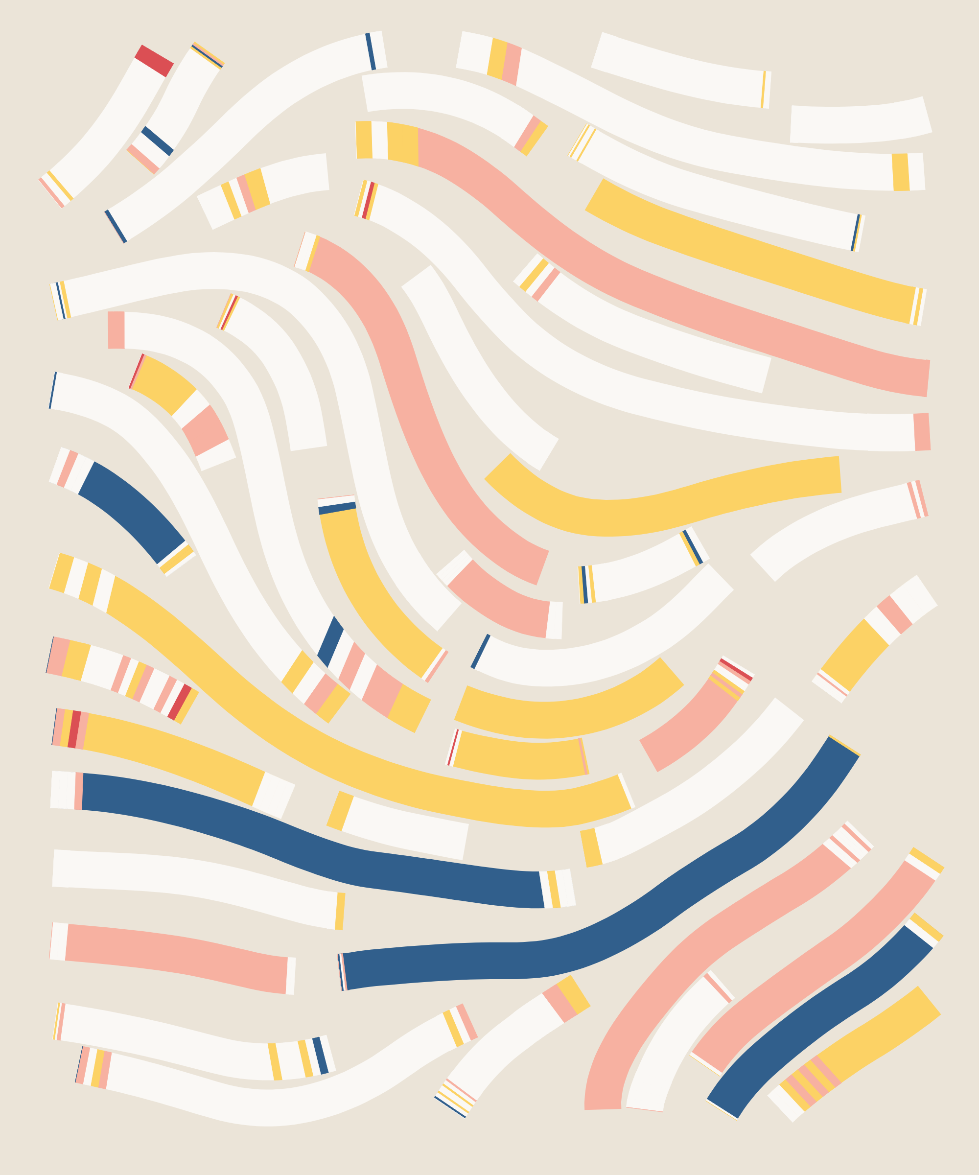 Fidenza is by far my most versatile algorithm to date. Although the program stays focused on structured curves and blocks, the varieties of scale, organization, texture, and color usage it can employ create a wide array of generative possibilities.