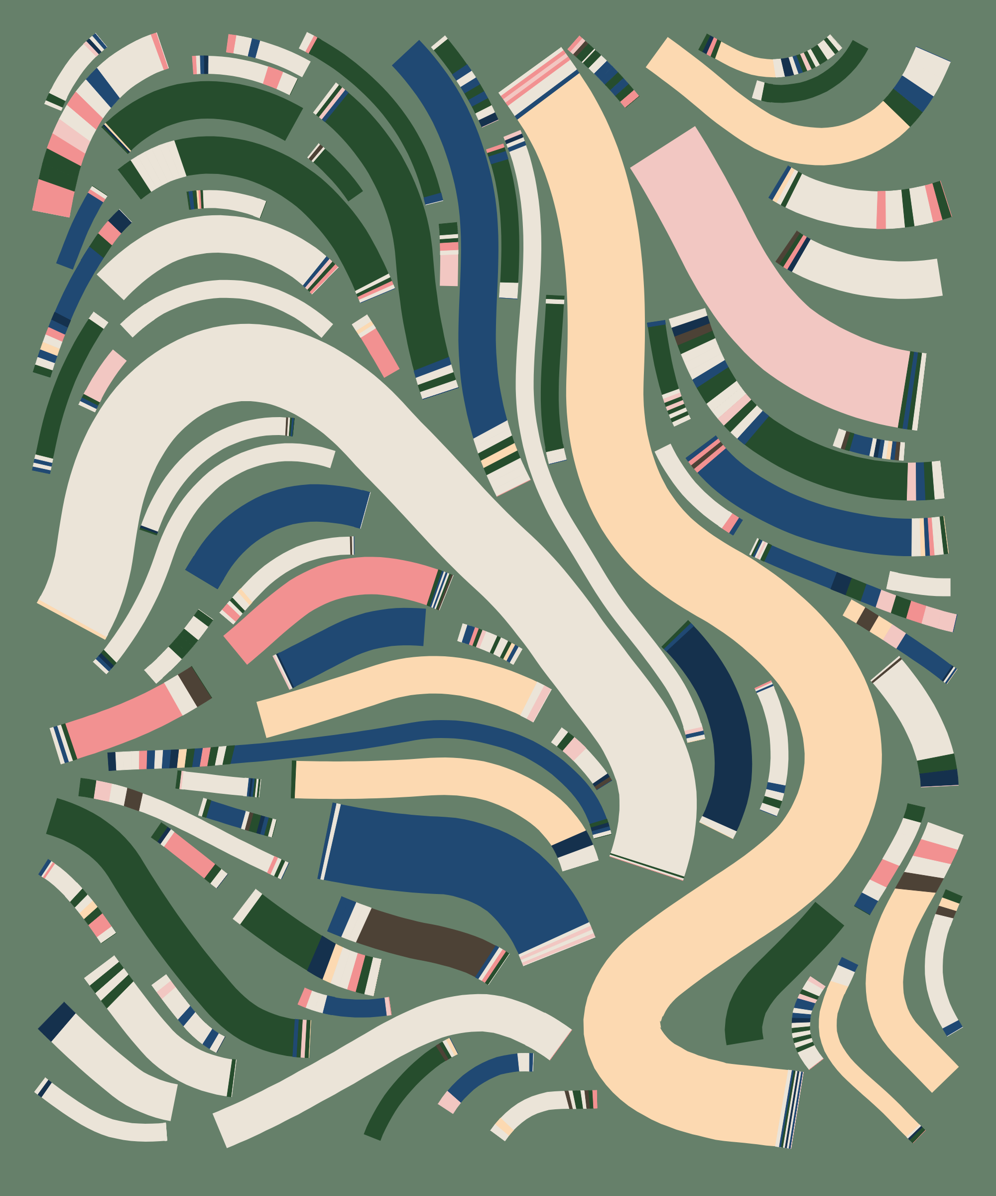 Fidenza is by far my most versatile algorithm to date. Although the program stays focused on structured curves and blocks, the varieties of scale, organization, texture, and color usage it can employ create a wide array of generative possibilities.