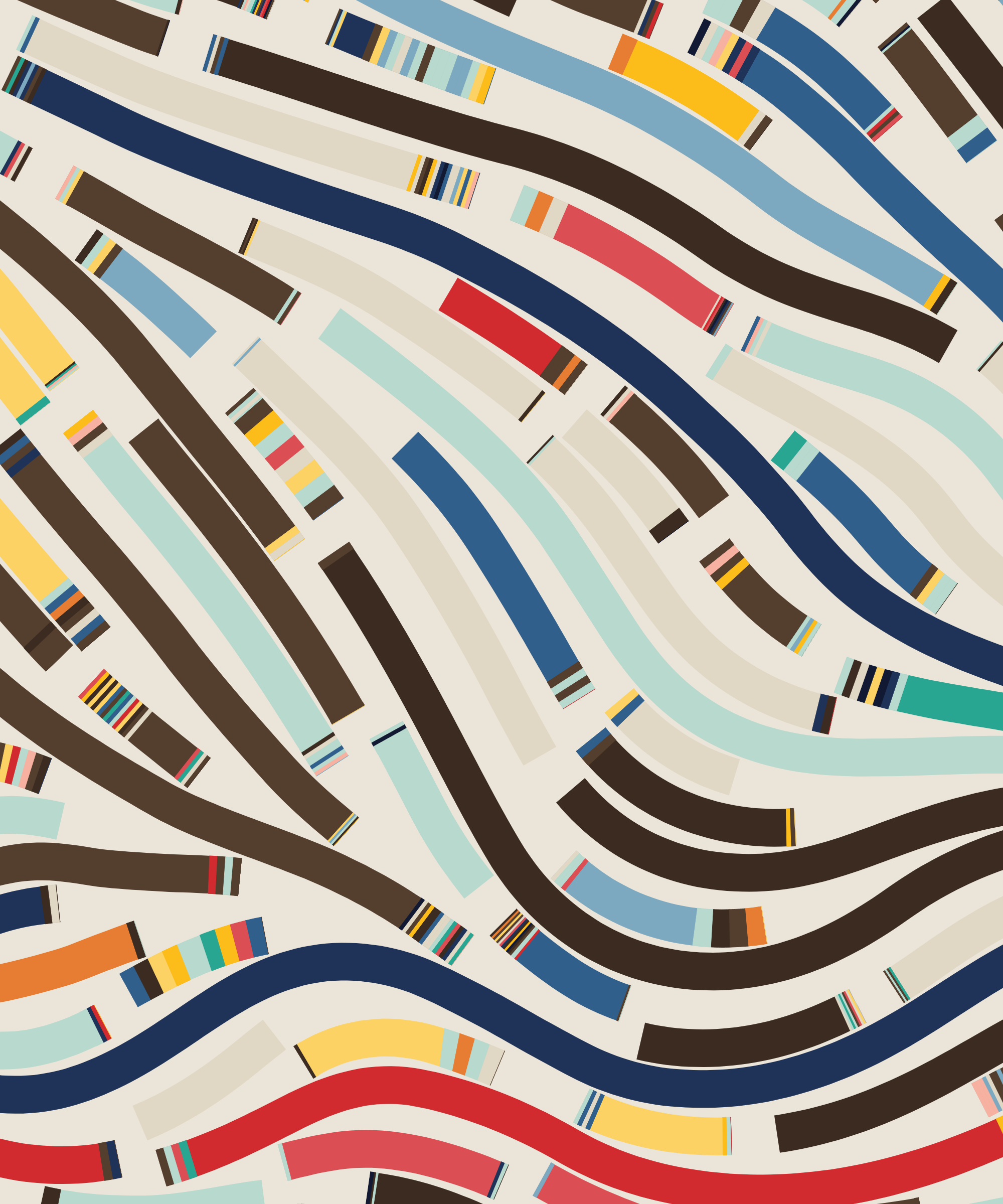 Fidenza is by far my most versatile algorithm to date. Although the program stays focused on structured curves and blocks, the varieties of scale, organization, texture, and color usage it can employ create a wide array of generative possibilities.