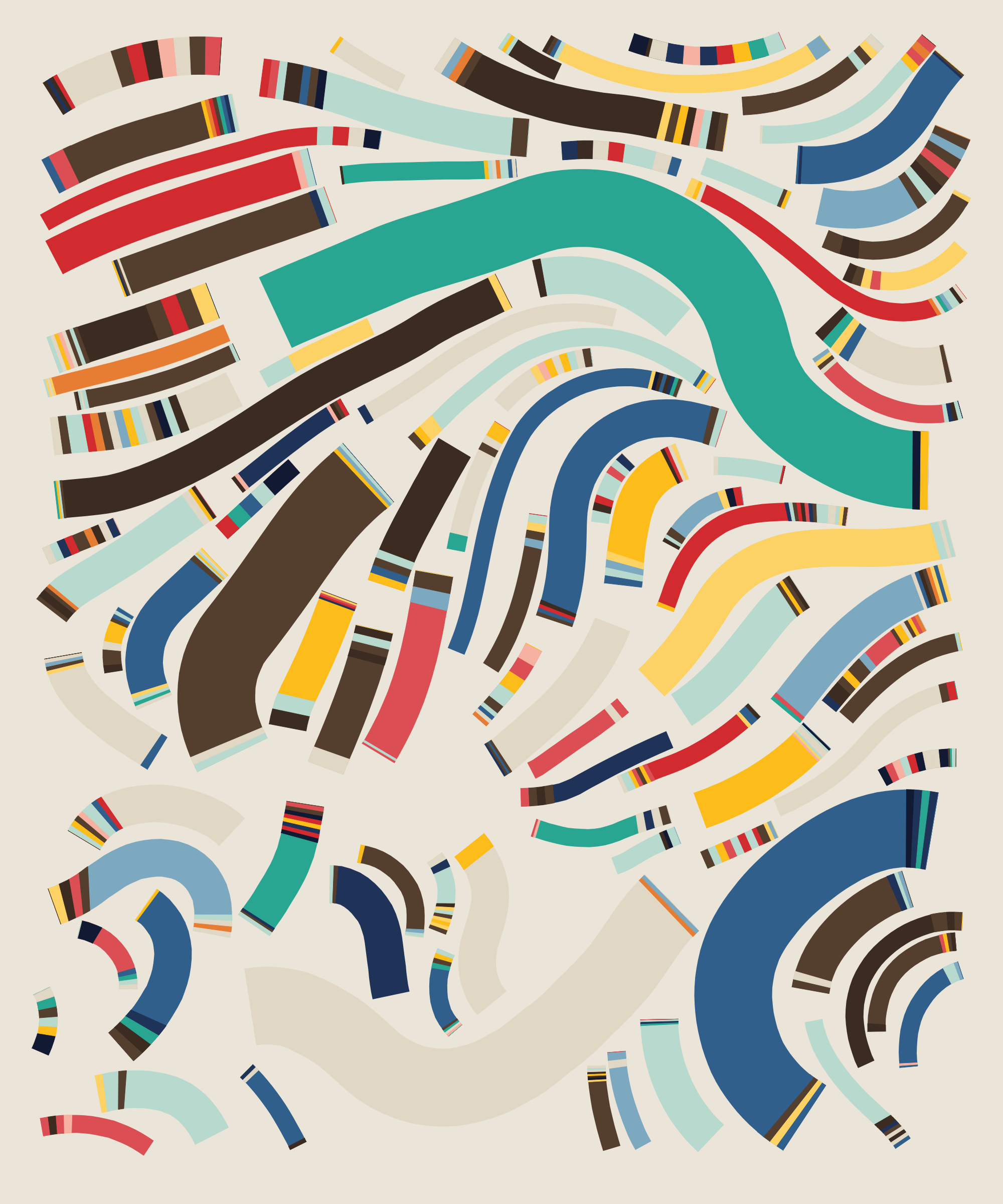 Fidenza is by far my most versatile algorithm to date. Although the program stays focused on structured curves and blocks, the varieties of scale, organization, texture, and color usage it can employ create a wide array of generative possibilities.