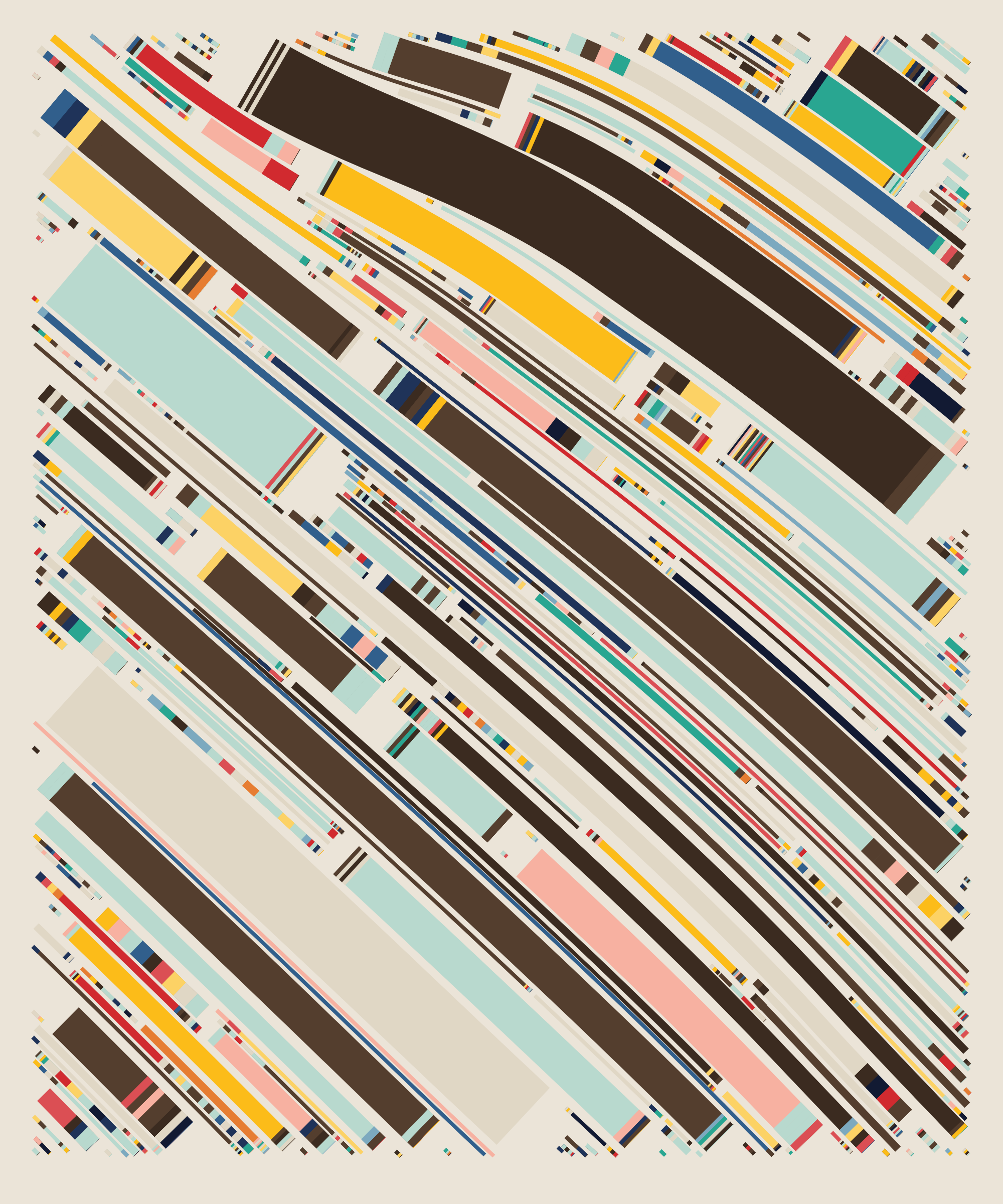 Fidenza is by far my most versatile algorithm to date. Although the program stays focused on structured curves and blocks, the varieties of scale, organization, texture, and color usage it can employ create a wide array of generative possibilities.