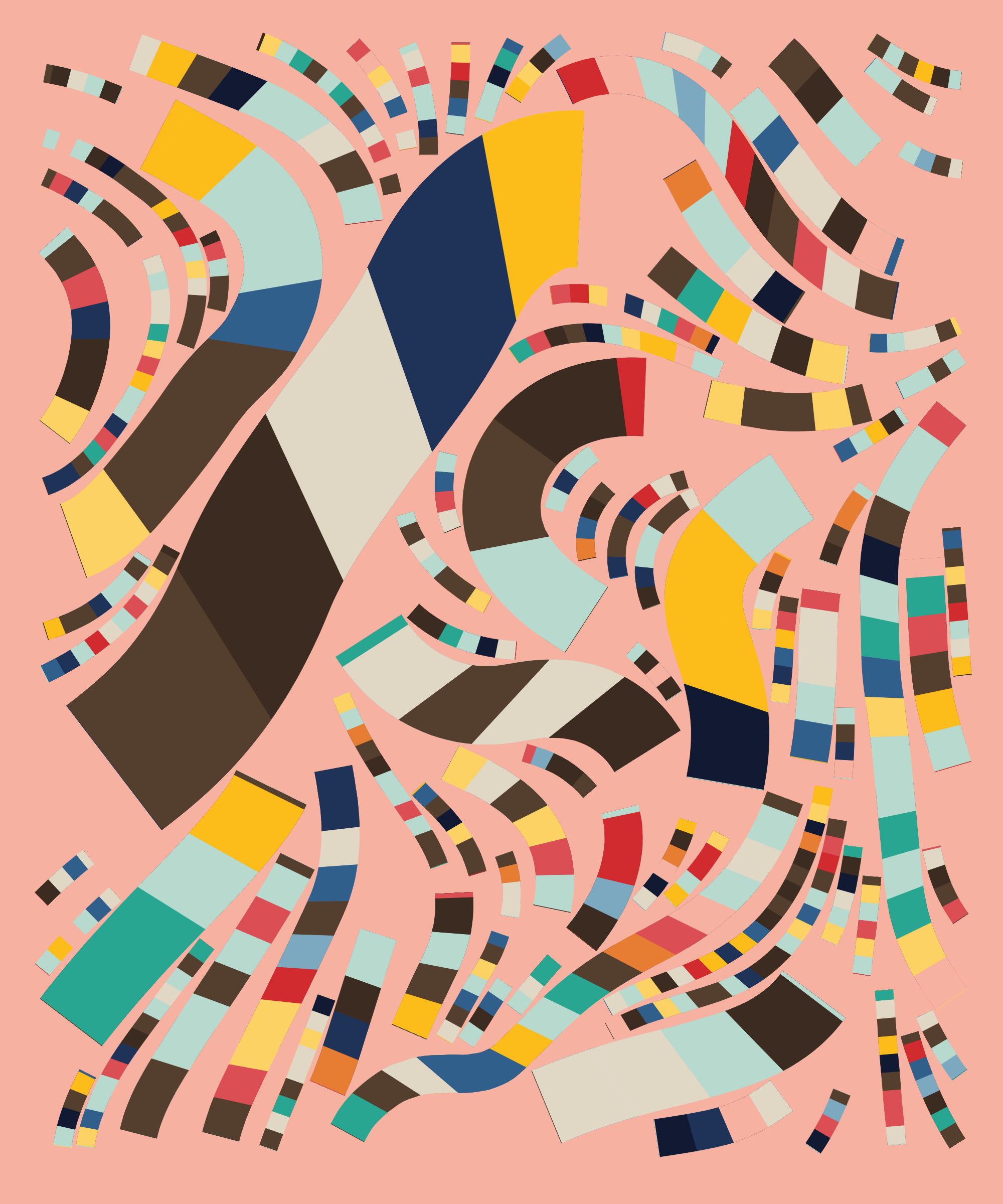 Fidenza is by far my most versatile algorithm to date. Although the program stays focused on structured curves and blocks, the varieties of scale, organization, texture, and color usage it can employ create a wide array of generative possibilities.