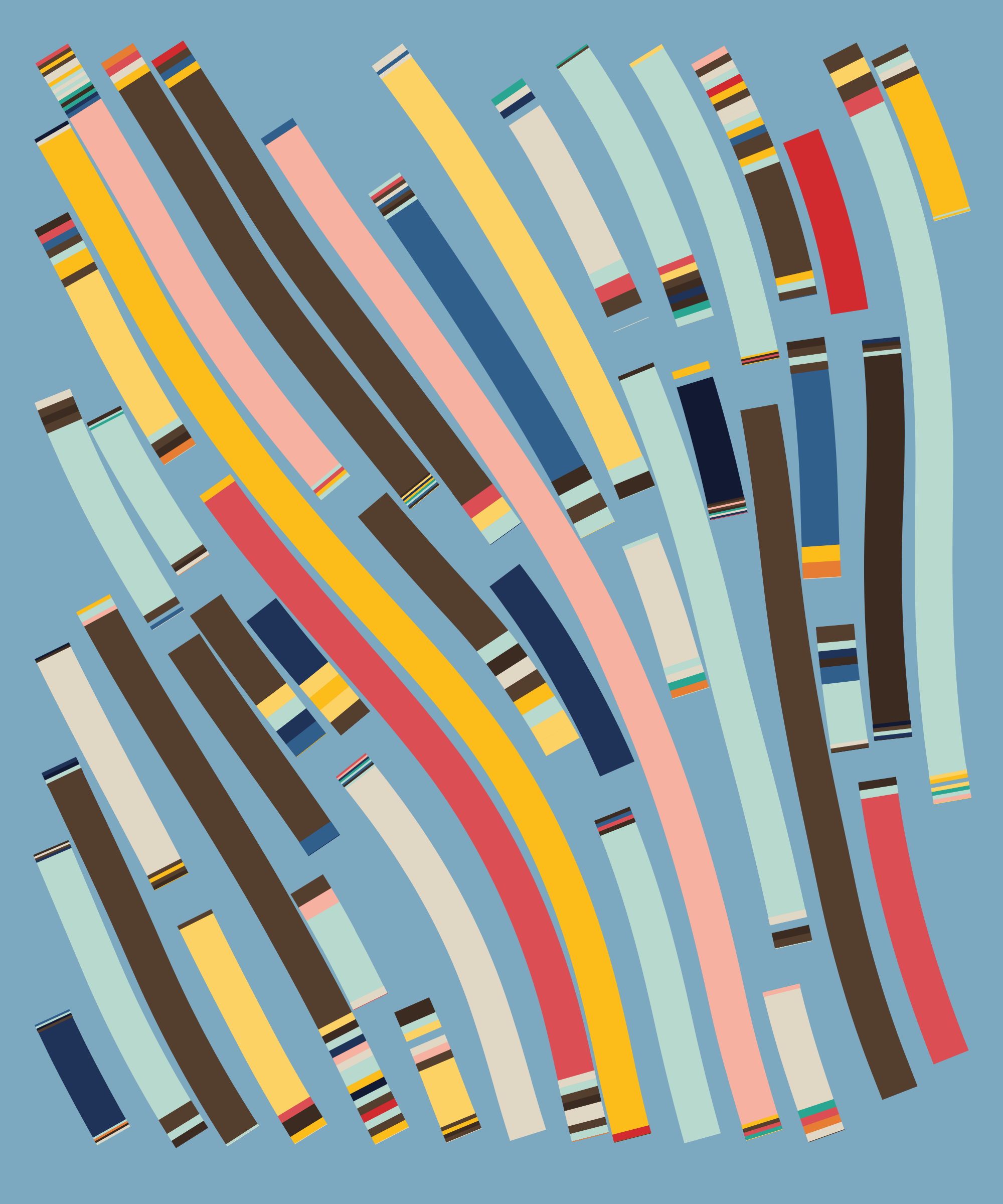 Fidenza is by far my most versatile algorithm to date. Although the program stays focused on structured curves and blocks, the varieties of scale, organization, texture, and color usage it can employ create a wide array of generative possibilities.