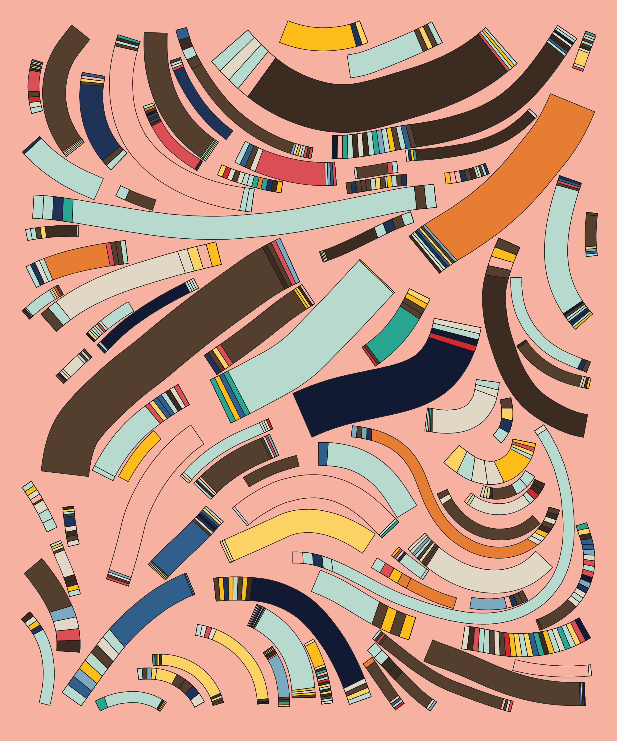 Fidenza is by far my most versatile algorithm to date. Although the program stays focused on structured curves and blocks, the varieties of scale, organization, texture, and color usage it can employ create a wide array of generative possibilities.