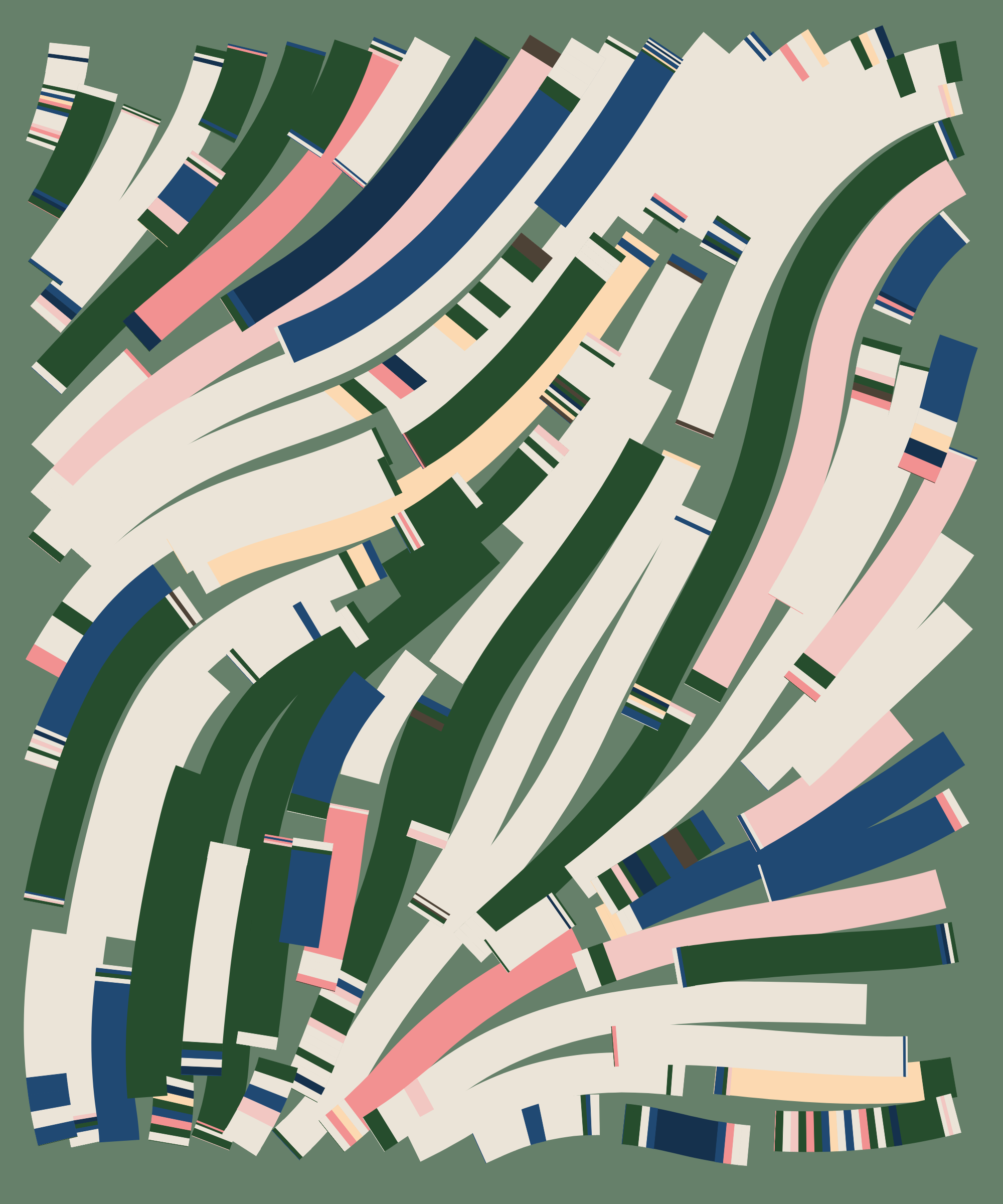 Fidenza is by far my most versatile algorithm to date. Although the program stays focused on structured curves and blocks, the varieties of scale, organization, texture, and color usage it can employ create a wide array of generative possibilities.
