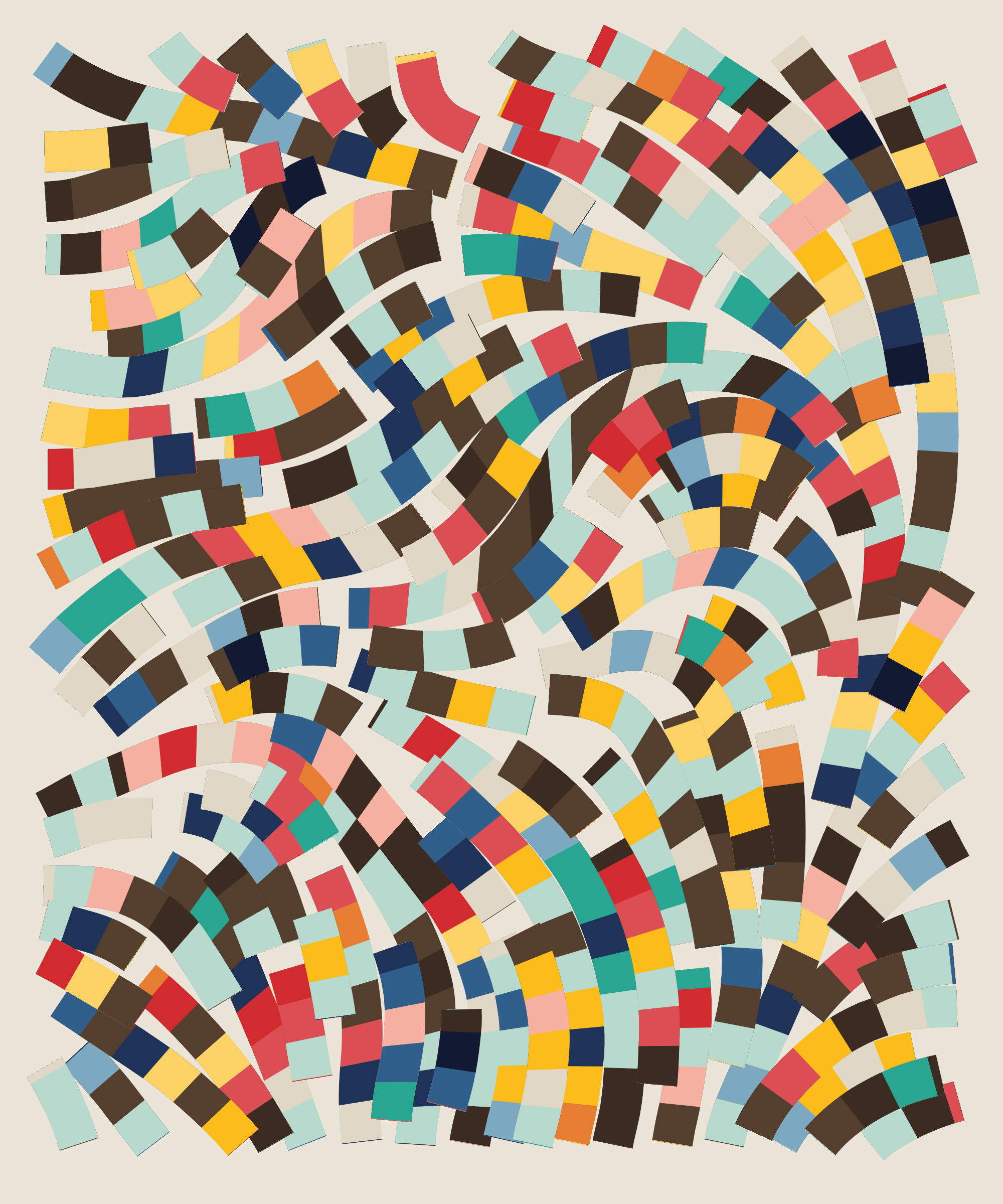 Fidenza is by far my most versatile algorithm to date. Although the program stays focused on structured curves and blocks, the varieties of scale, organization, texture, and color usage it can employ create a wide array of generative possibilities.