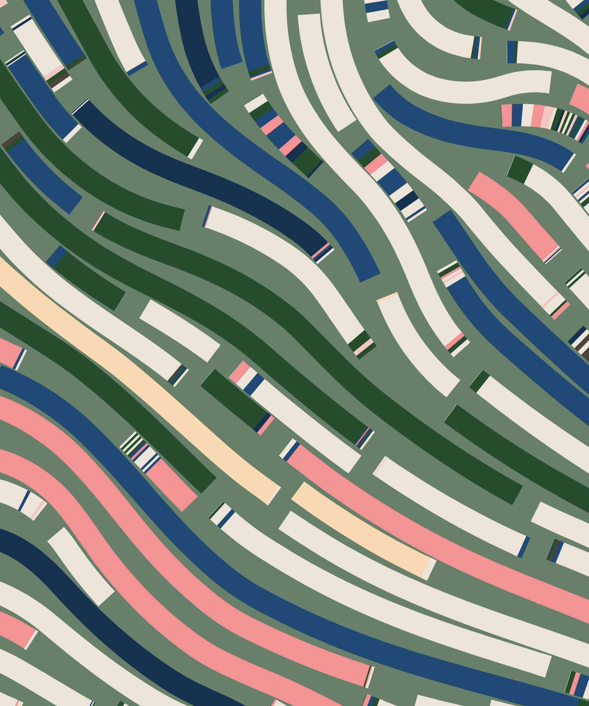 Fidenza is by far my most versatile algorithm to date. Although the program stays focused on structured curves and blocks, the varieties of scale, organization, texture, and color usage it can employ create a wide array of generative possibilities.