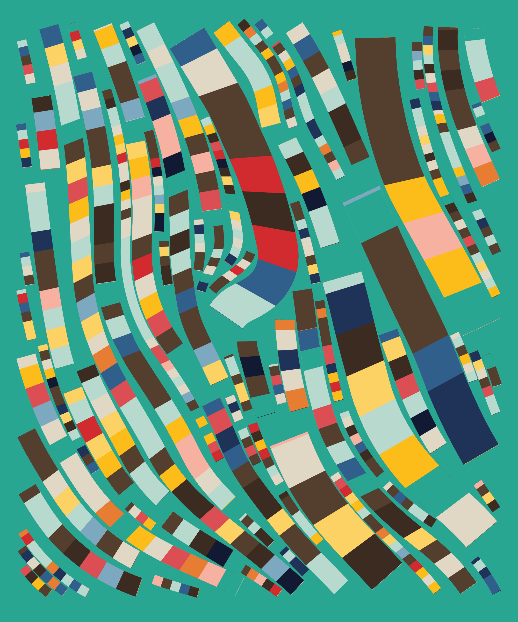 Fidenza is by far my most versatile algorithm to date. Although the program stays focused on structured curves and blocks, the varieties of scale, organization, texture, and color usage it can employ create a wide array of generative possibilities.