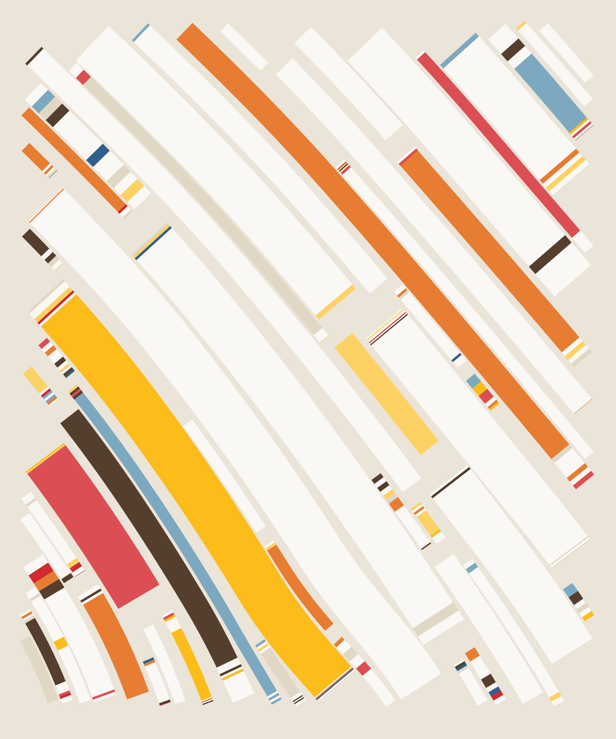 Fidenza is by far my most versatile algorithm to date. Although the program stays focused on structured curves and blocks, the varieties of scale, organization, texture, and color usage it can employ create a wide array of generative possibilities.