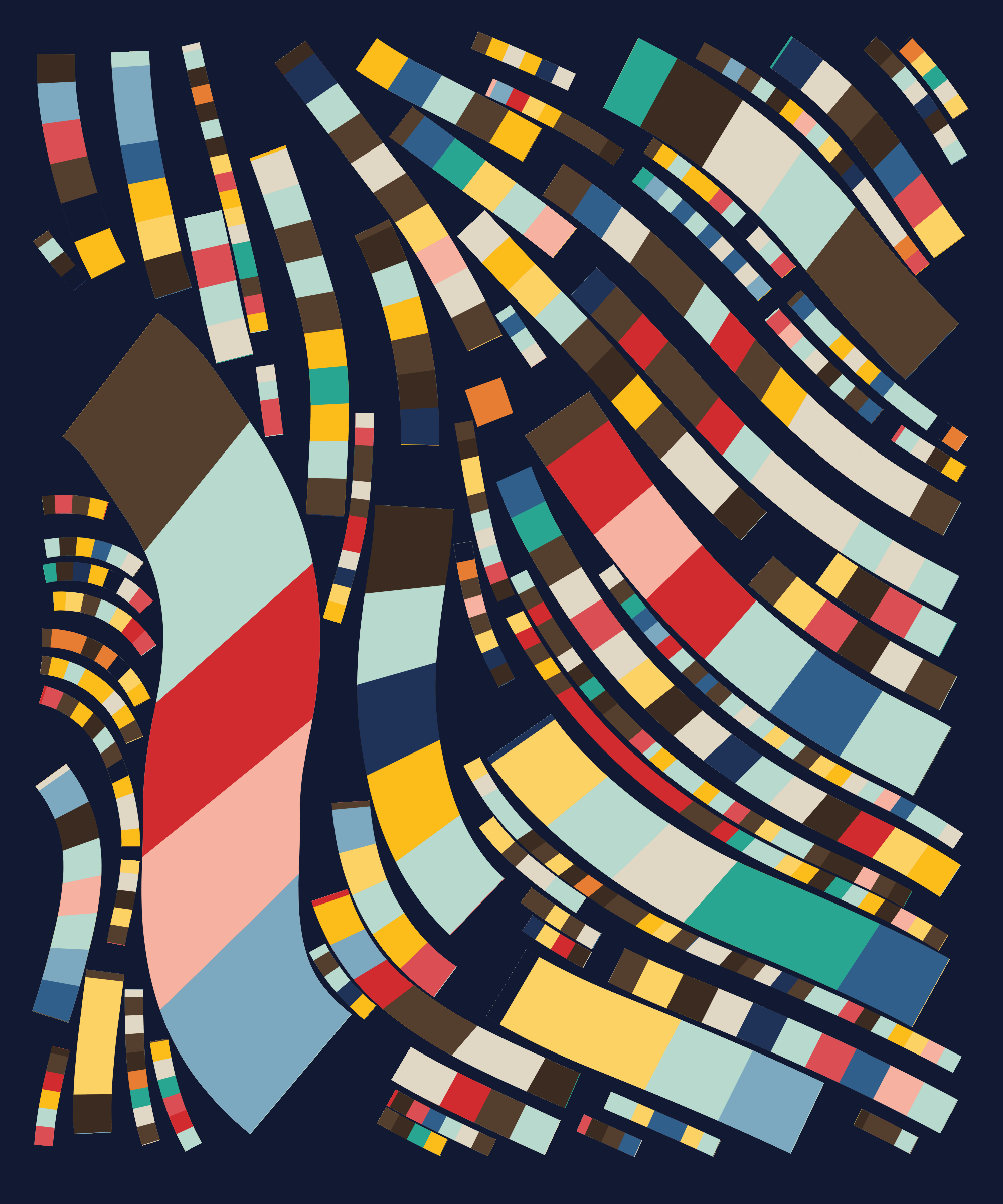 Fidenza is by far my most versatile algorithm to date. Although the program stays focused on structured curves and blocks, the varieties of scale, organization, texture, and color usage it can employ create a wide array of generative possibilities.
