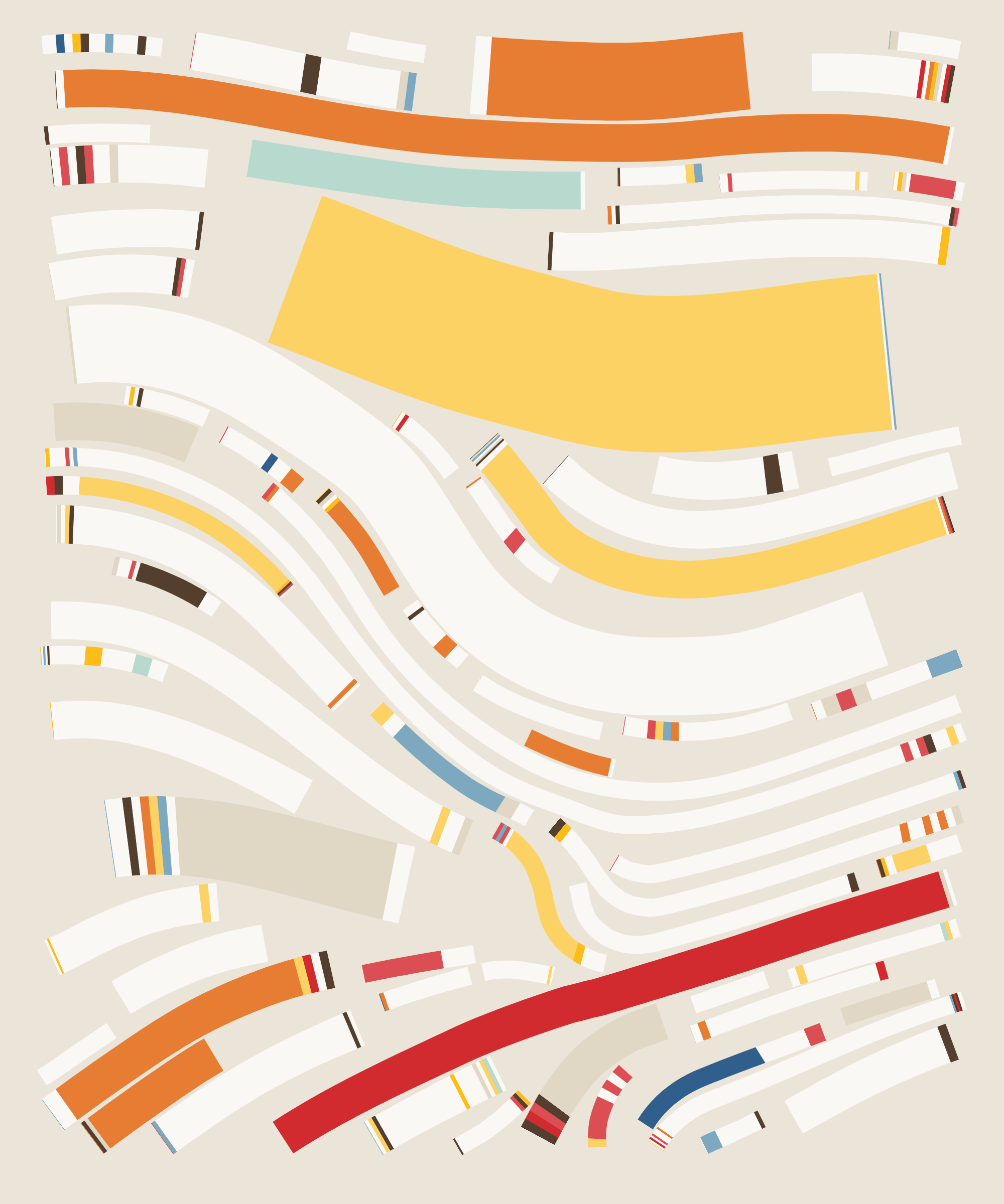 Fidenza is by far my most versatile algorithm to date. Although the program stays focused on structured curves and blocks, the varieties of scale, organization, texture, and color usage it can employ create a wide array of generative possibilities.