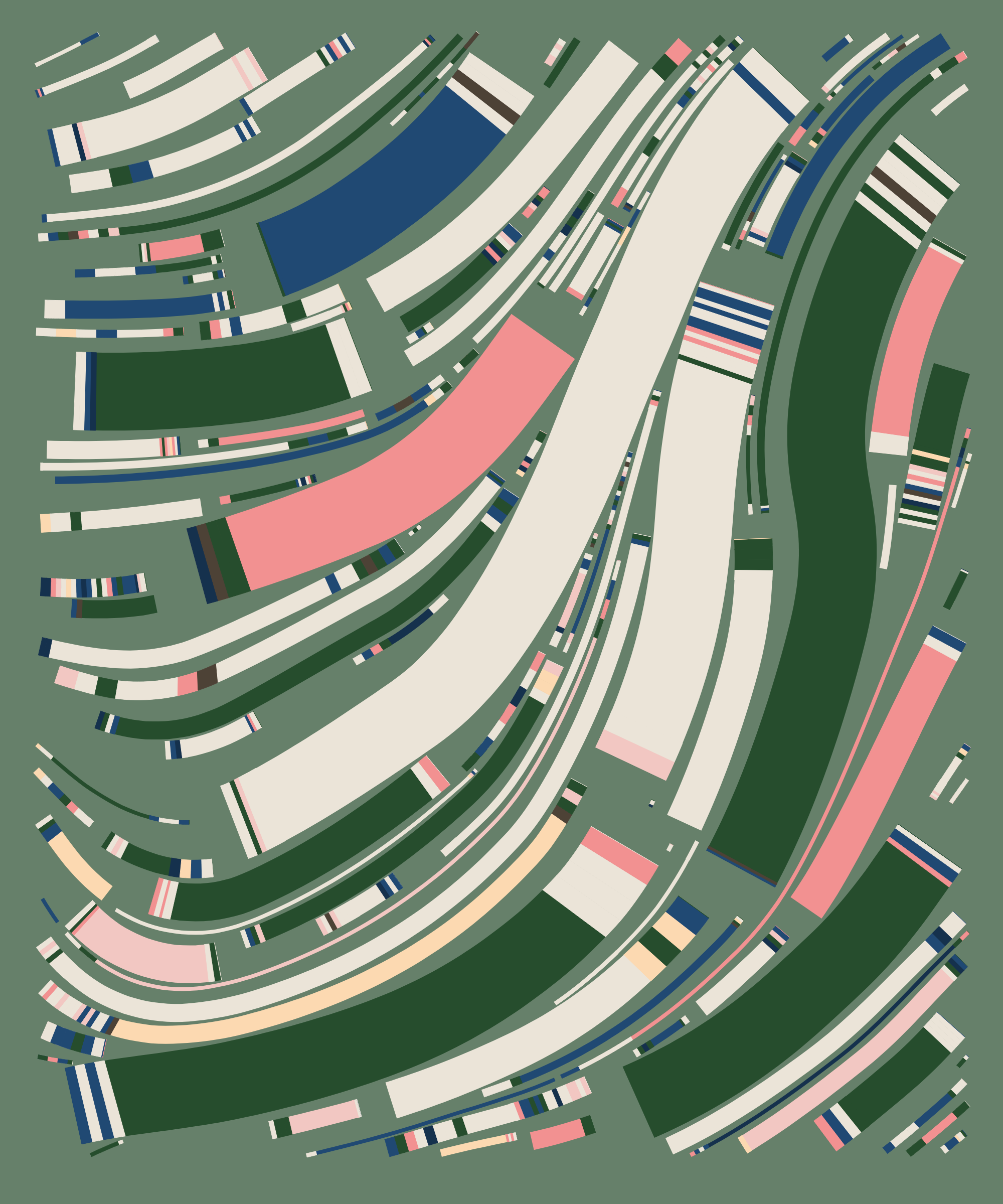 Fidenza is by far my most versatile algorithm to date. Although the program stays focused on structured curves and blocks, the varieties of scale, organization, texture, and color usage it can employ create a wide array of generative possibilities.
