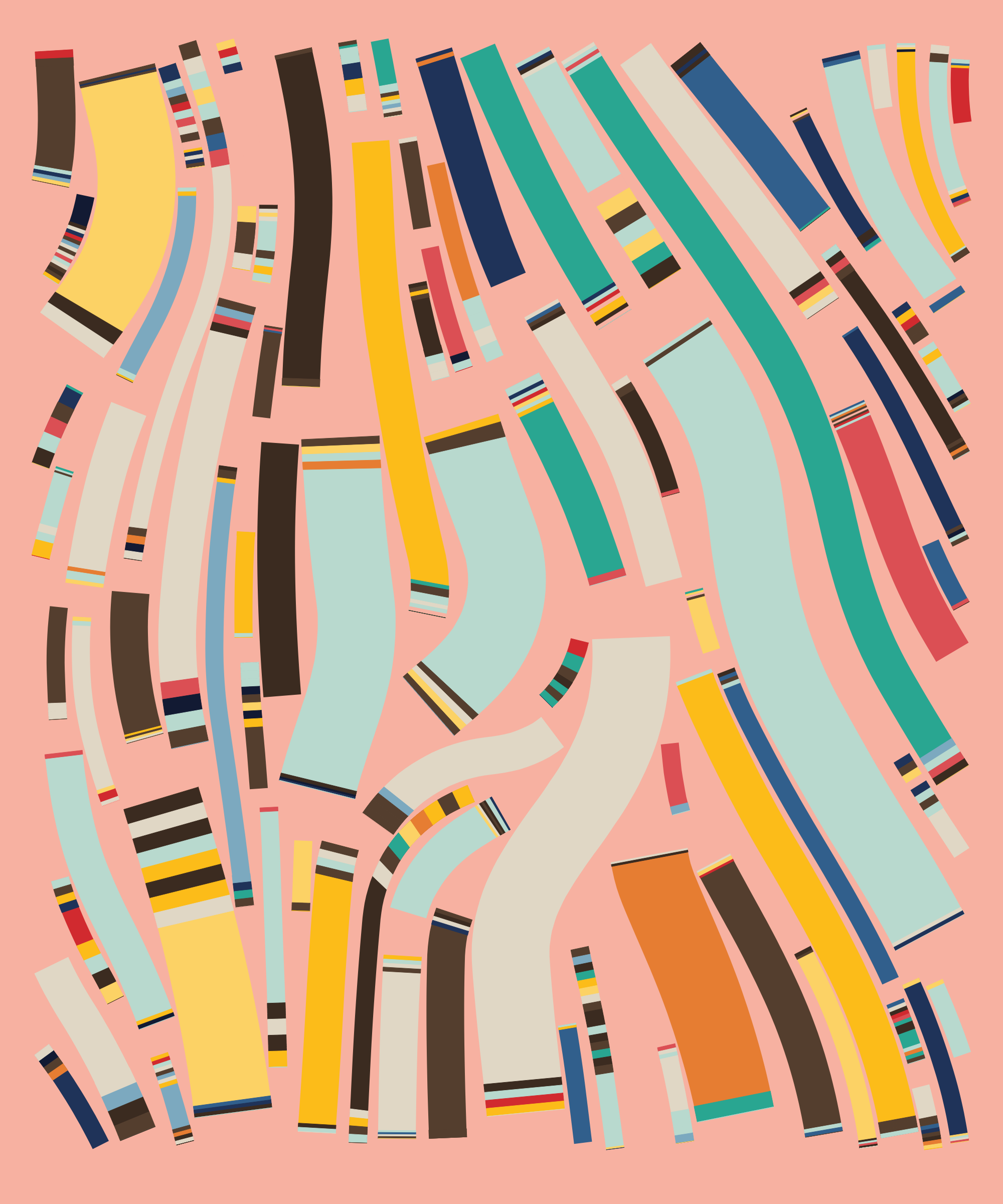 Fidenza is by far my most versatile algorithm to date. Although the program stays focused on structured curves and blocks, the varieties of scale, organization, texture, and color usage it can employ create a wide array of generative possibilities.