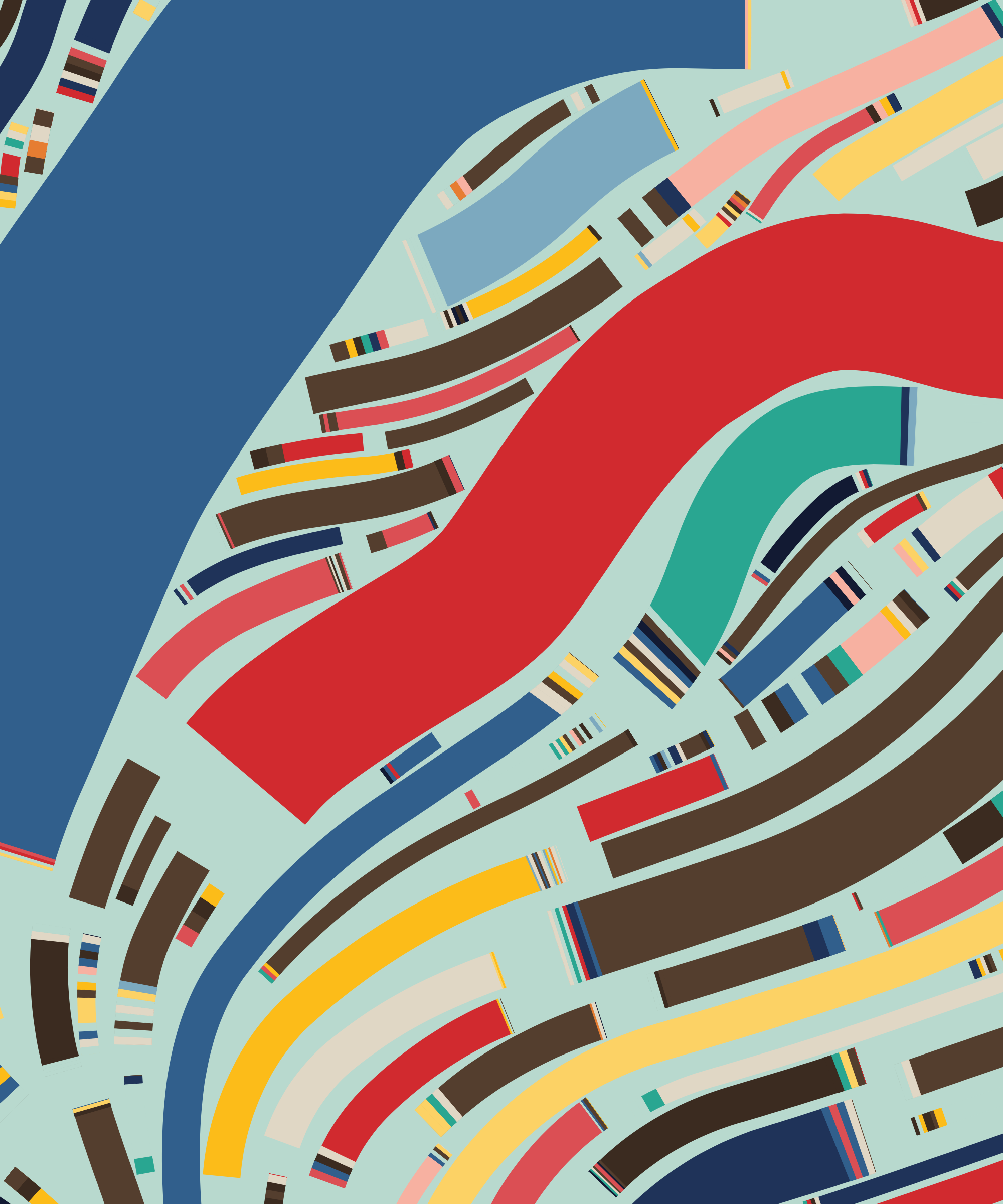 Fidenza is by far my most versatile algorithm to date. Although the program stays focused on structured curves and blocks, the varieties of scale, organization, texture, and color usage it can employ create a wide array of generative possibilities.