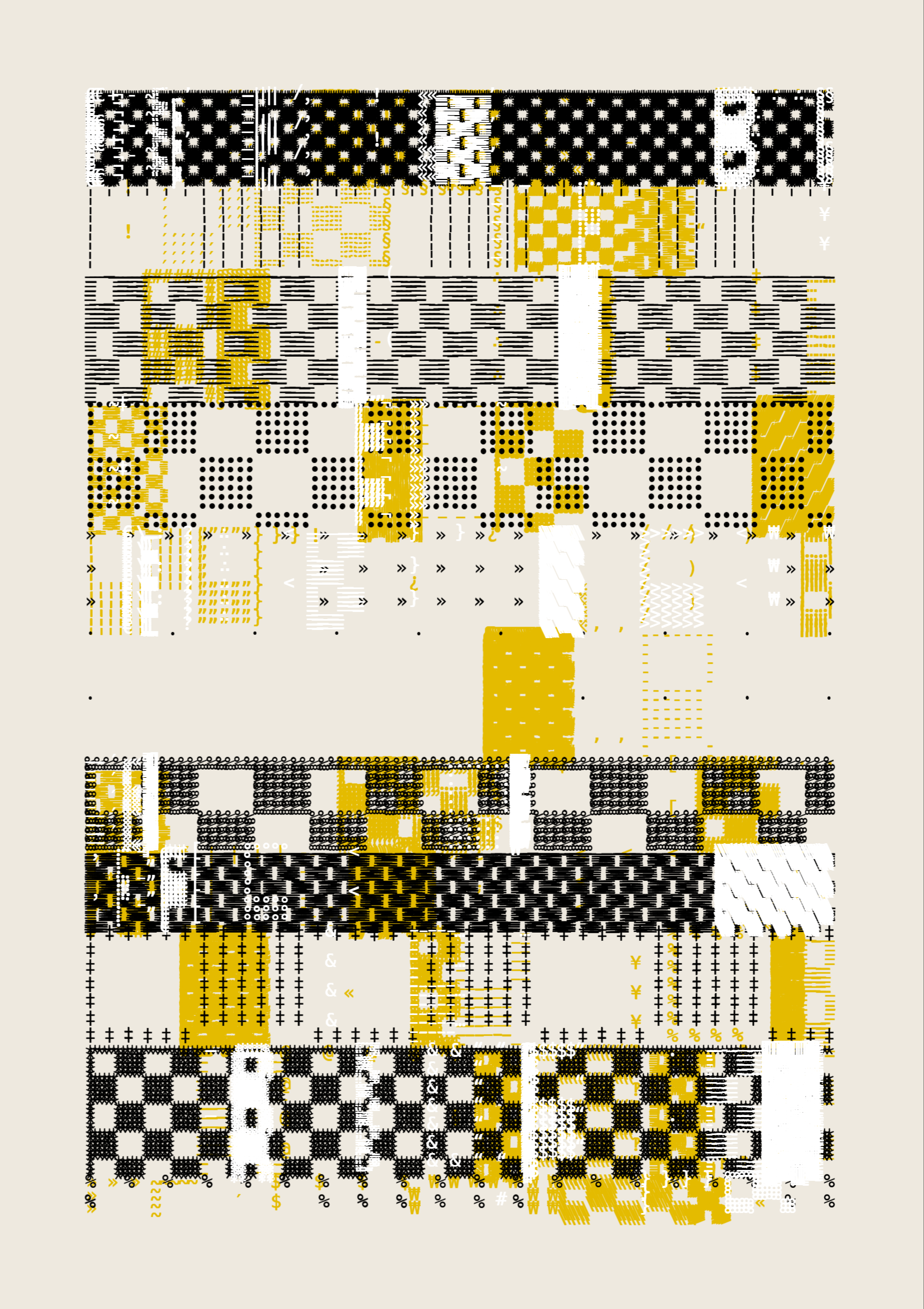 FOLIO is a generative drawing system, inspired by concrete poetry and early computer artwork, that emits an output process for a given input. Each output may be realized digitally, in print, or through another medium. The drawing system, coded in JavaScript, recursively packs bins of data to fill the page, constrained entirely by the use of typographic glyphs and a limited mono-, duo-, or tri-colour palette.