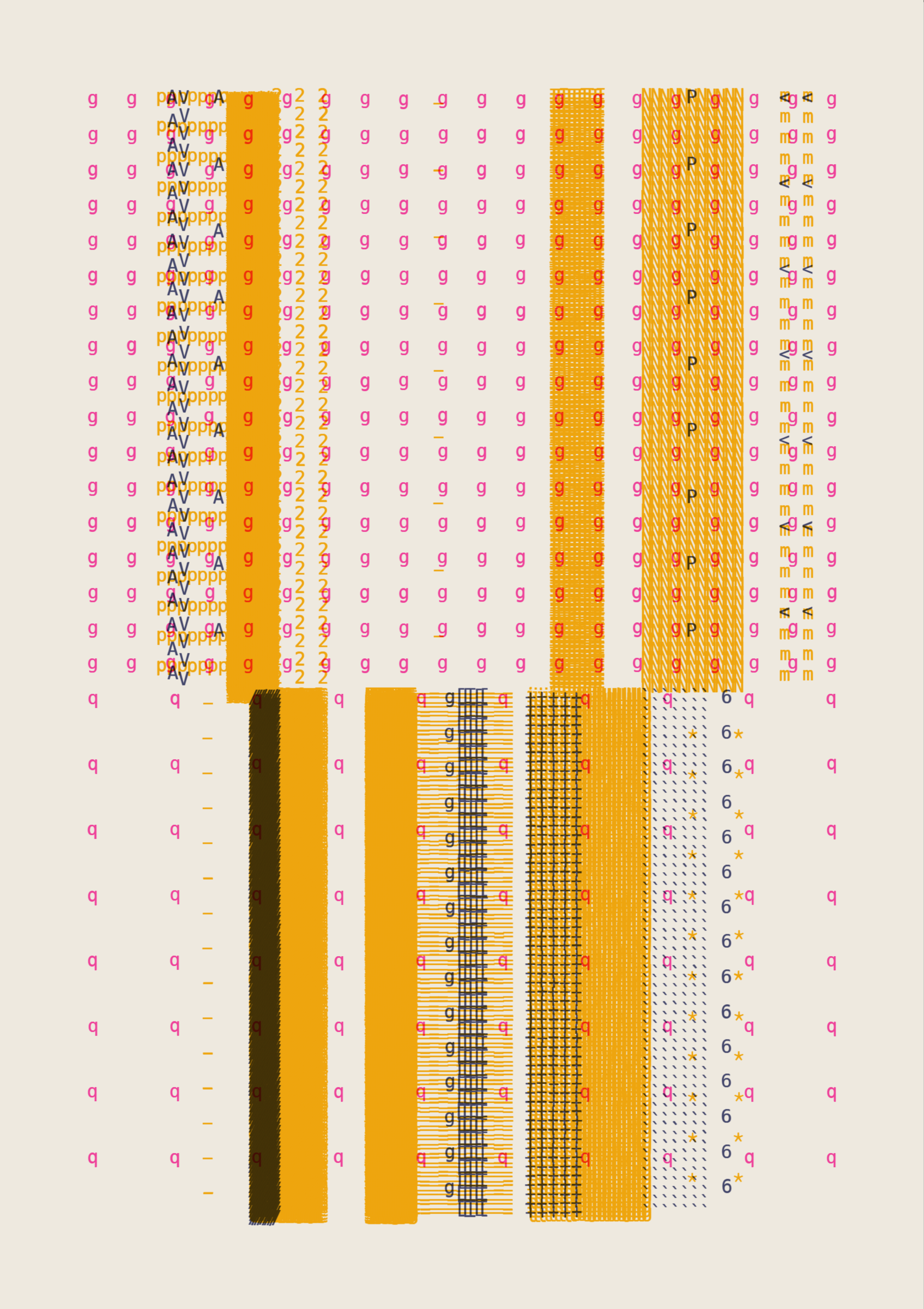 FOLIO is a generative drawing system, inspired by concrete poetry and early computer artwork, that emits an output process for a given input. Each output may be realized digitally, in print, or through another medium. The drawing system, coded in JavaScript, recursively packs bins of data to fill the page, constrained entirely by the use of typographic glyphs and a limited mono-, duo-, or tri-colour palette.