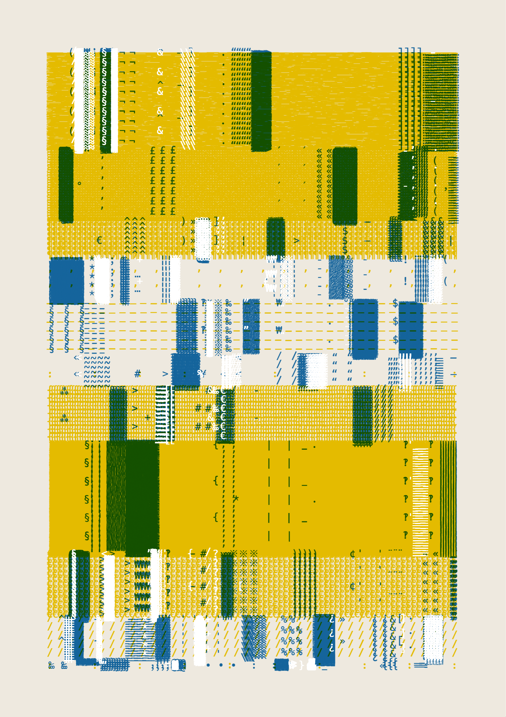 FOLIO is a generative drawing system, inspired by concrete poetry and early computer artwork, that emits an output process for a given input. Each output may be realized digitally, in print, or through another medium. The drawing system, coded in JavaScript, recursively packs bins of data to fill the page, constrained entirely by the use of typographic glyphs and a limited mono-, duo-, or tri-colour palette.