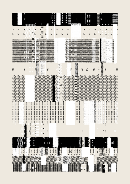 FOLIO is a generative drawing system, inspired by concrete poetry and early computer artwork, that emits an output process for a given input. Each output may be realized digitally, in print, or through another medium. The drawing system, coded in JavaScript, recursively packs bins of data to fill the page, constrained entirely by the use of typographic glyphs and a limited mono-, duo-, or tri-colour palette.