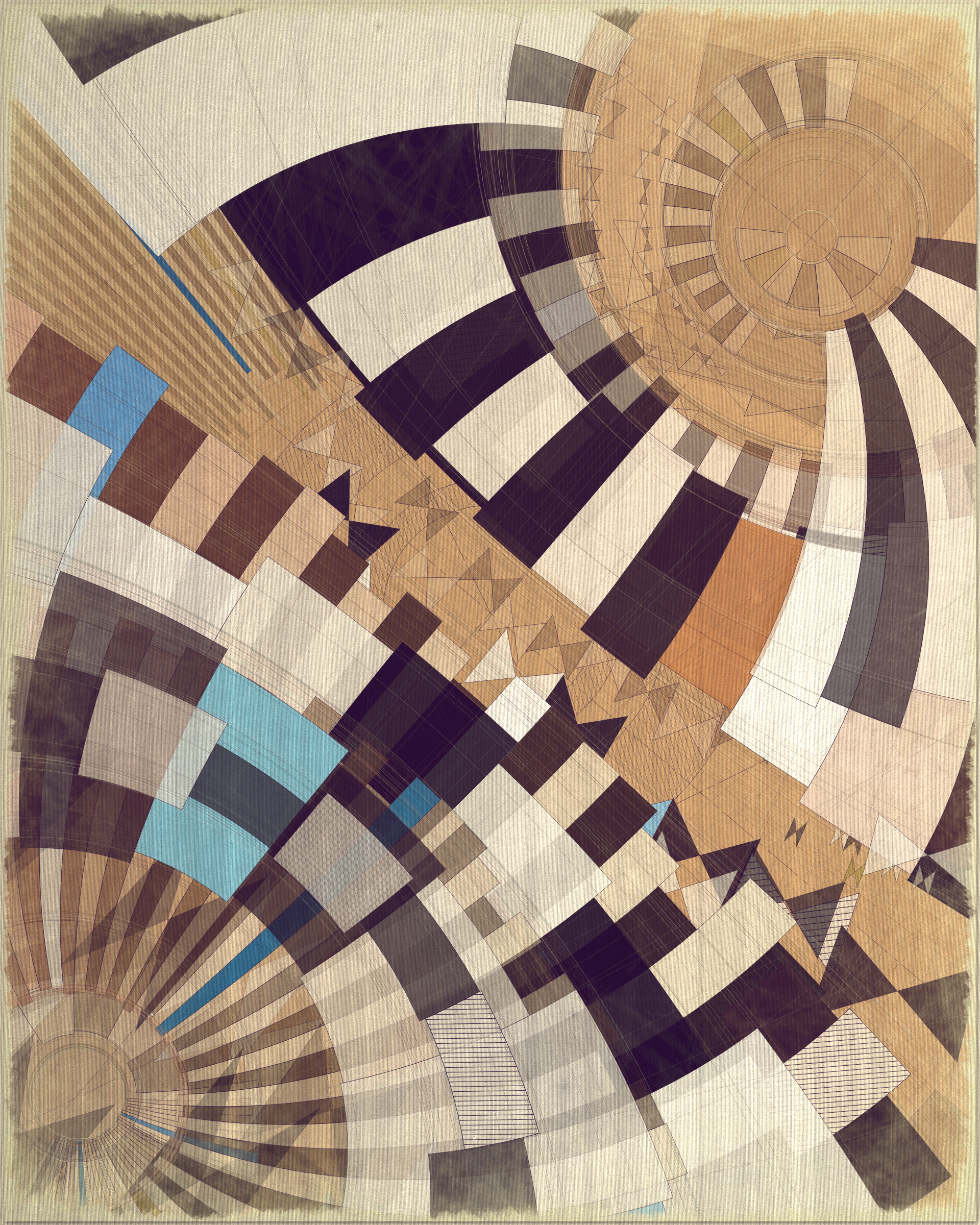 This project is a playful attempt at abstractly capturing the flowing movement of a fountain using precisely drawn elements that evoke a static and considered rendering of a subject that is in constant flux. The visual language is reminiscent of hand-draughted technical drawing, a precise and methodical practice that progresses at a radically different pace to the flowing and capricious movement of water. To increase this tension between dynamic motion and static mechanical process I wanted the surface textures to appear worn and aged like a drawing that has spent its life in the bottom of a mechanics drawer. This process of abrasion and discoloration is occurring on yet another scale of time adding complexity to the references of time passing.