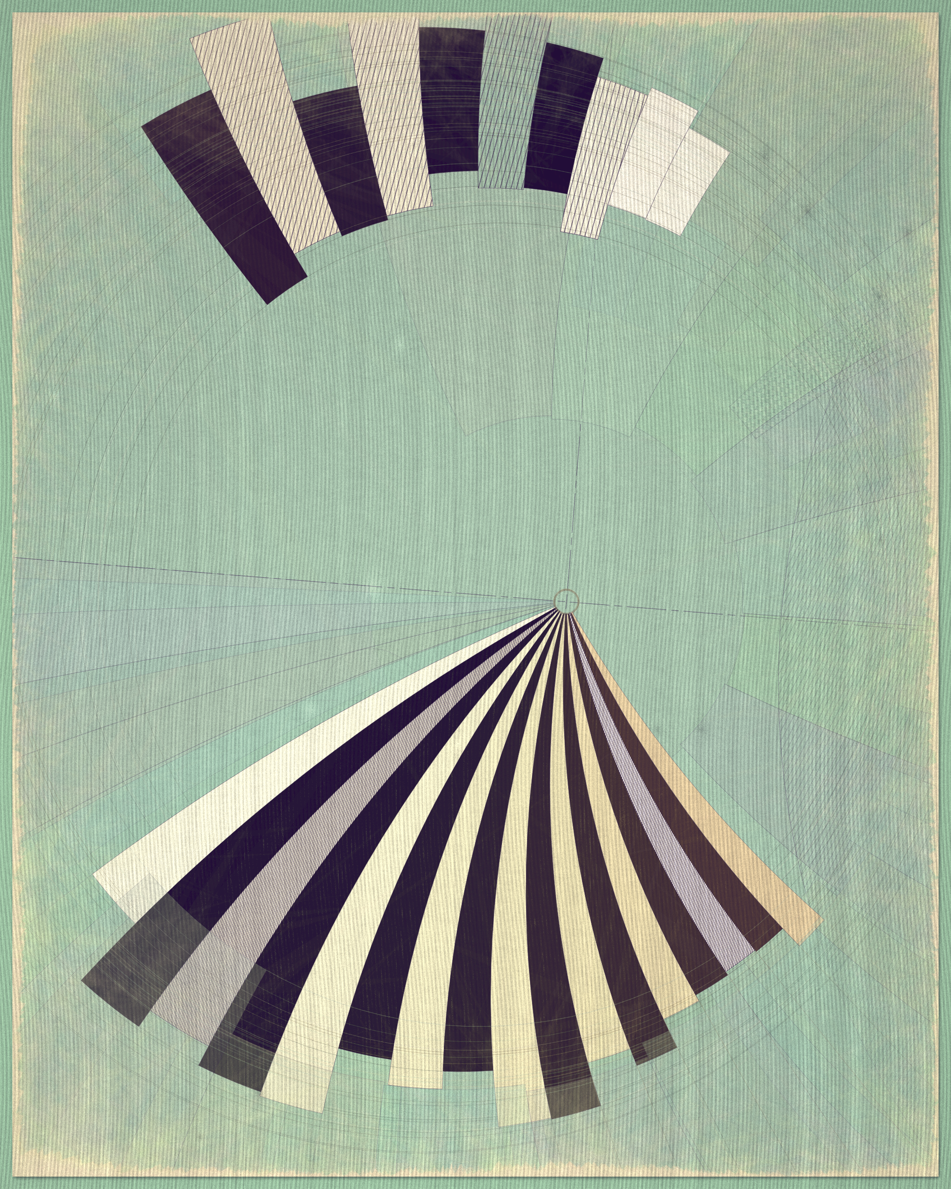 This project is a playful attempt at abstractly capturing the flowing movement of a fountain using precisely drawn elements that evoke a static and considered rendering of a subject that is in constant flux. The visual language is reminiscent of hand-draughted technical drawing, a precise and methodical practice that progresses at a radically different pace to the flowing and capricious movement of water. To increase this tension between dynamic motion and static mechanical process I wanted the surface textures to appear worn and aged like a drawing that has spent its life in the bottom of a mechanics drawer. This process of abrasion and discoloration is occurring on yet another scale of time adding complexity to the references of time passing.