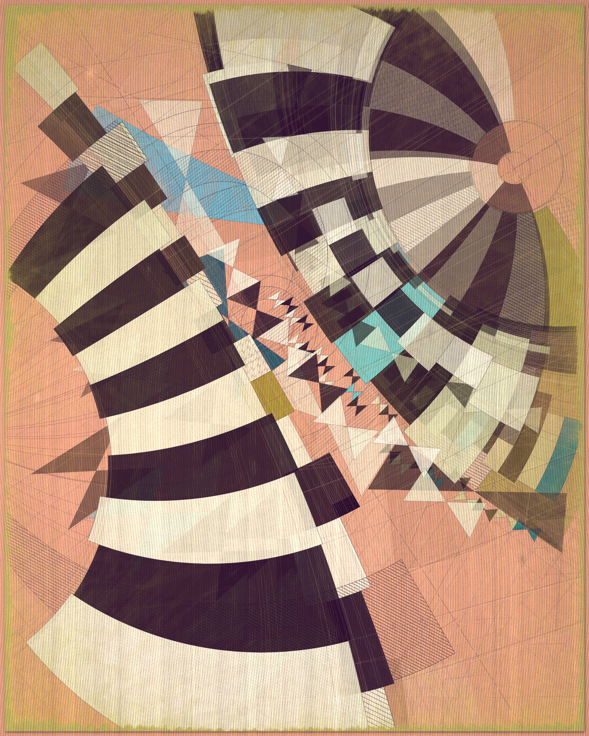 This project is a playful attempt at abstractly capturing the flowing movement of a fountain using precisely drawn elements that evoke a static and considered rendering of a subject that is in constant flux. The visual language is reminiscent of hand-draughted technical drawing, a precise and methodical practice that progresses at a radically different pace to the flowing and capricious movement of water. To increase this tension between dynamic motion and static mechanical process I wanted the surface textures to appear worn and aged like a drawing that has spent its life in the bottom of a mechanics drawer. This process of abrasion and discoloration is occurring on yet another scale of time adding complexity to the references of time passing.
