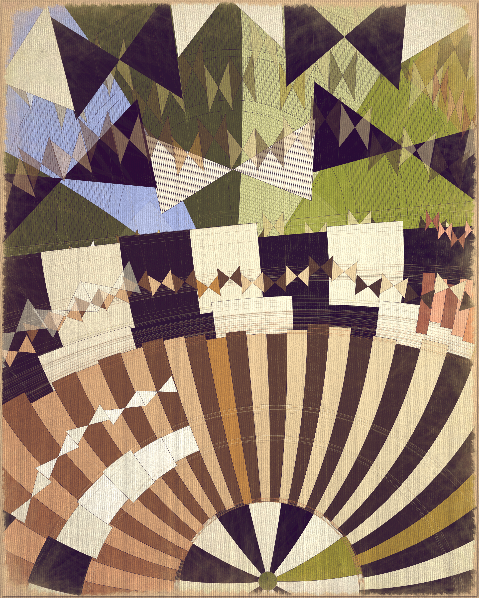 This project is a playful attempt at abstractly capturing the flowing movement of a fountain using precisely drawn elements that evoke a static and considered rendering of a subject that is in constant flux. The visual language is reminiscent of hand-draughted technical drawing, a precise and methodical practice that progresses at a radically different pace to the flowing and capricious movement of water. To increase this tension between dynamic motion and static mechanical process I wanted the surface textures to appear worn and aged like a drawing that has spent its life in the bottom of a mechanics drawer. This process of abrasion and discoloration is occurring on yet another scale of time adding complexity to the references of time passing.