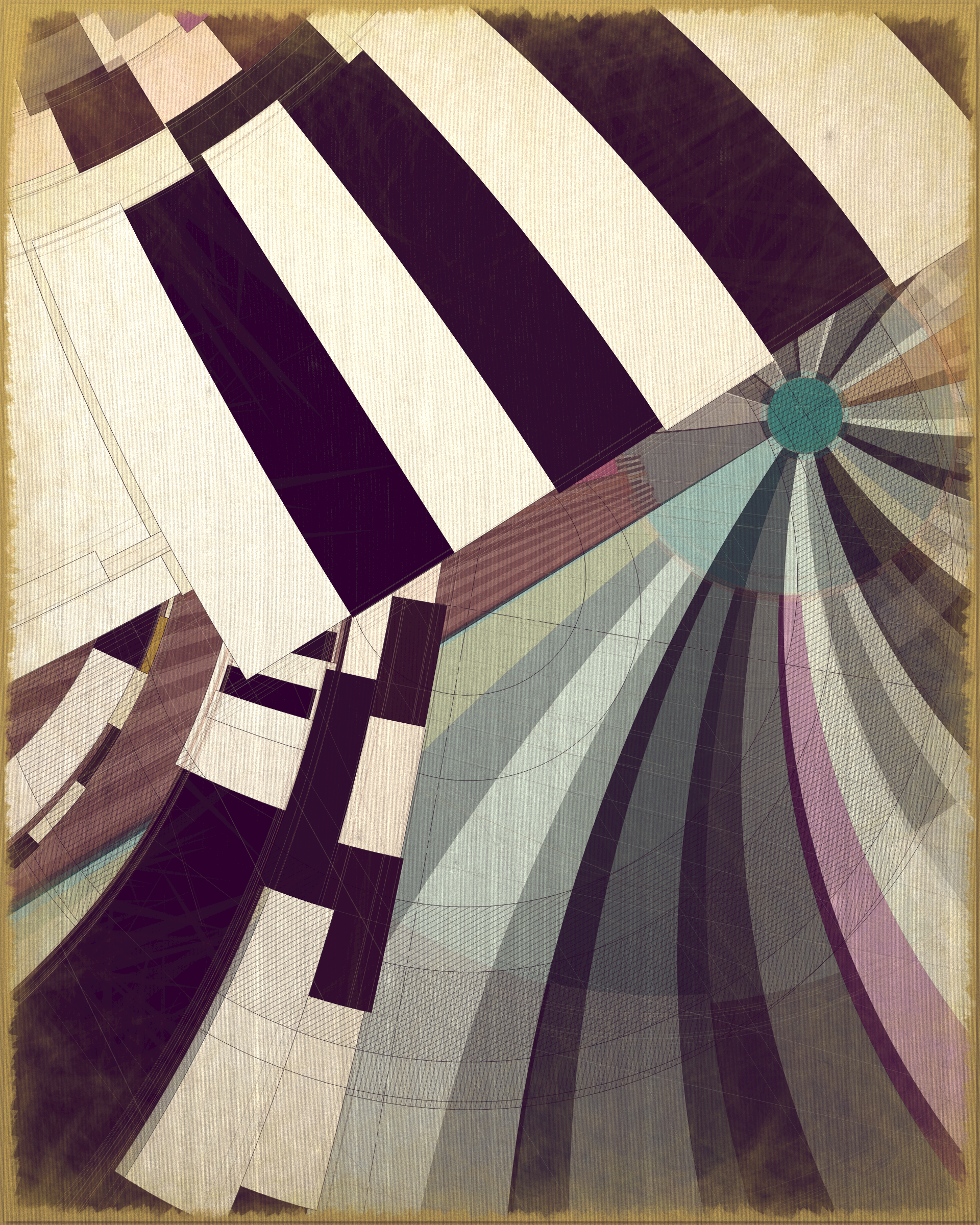 This project is a playful attempt at abstractly capturing the flowing movement of a fountain using precisely drawn elements that evoke a static and considered rendering of a subject that is in constant flux. The visual language is reminiscent of hand-draughted technical drawing, a precise and methodical practice that progresses at a radically different pace to the flowing and capricious movement of water. To increase this tension between dynamic motion and static mechanical process I wanted the surface textures to appear worn and aged like a drawing that has spent its life in the bottom of a mechanics drawer. This process of abrasion and discoloration is occurring on yet another scale of time adding complexity to the references of time passing.