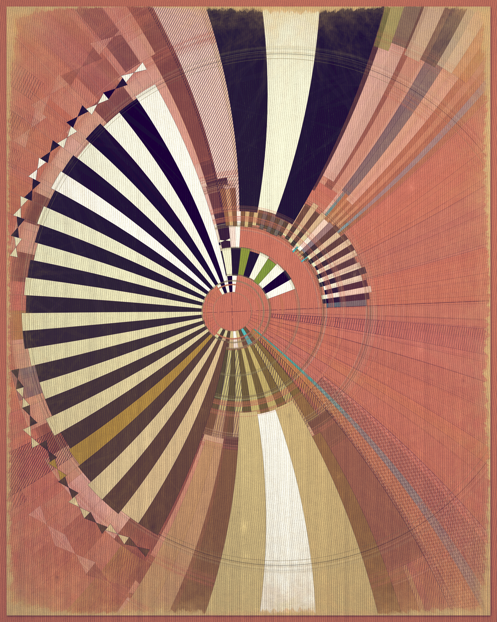 This project is a playful attempt at abstractly capturing the flowing movement of a fountain using precisely drawn elements that evoke a static and considered rendering of a subject that is in constant flux. The visual language is reminiscent of hand-draughted technical drawing, a precise and methodical practice that progresses at a radically different pace to the flowing and capricious movement of water. To increase this tension between dynamic motion and static mechanical process I wanted the surface textures to appear worn and aged like a drawing that has spent its life in the bottom of a mechanics drawer. This process of abrasion and discoloration is occurring on yet another scale of time adding complexity to the references of time passing.