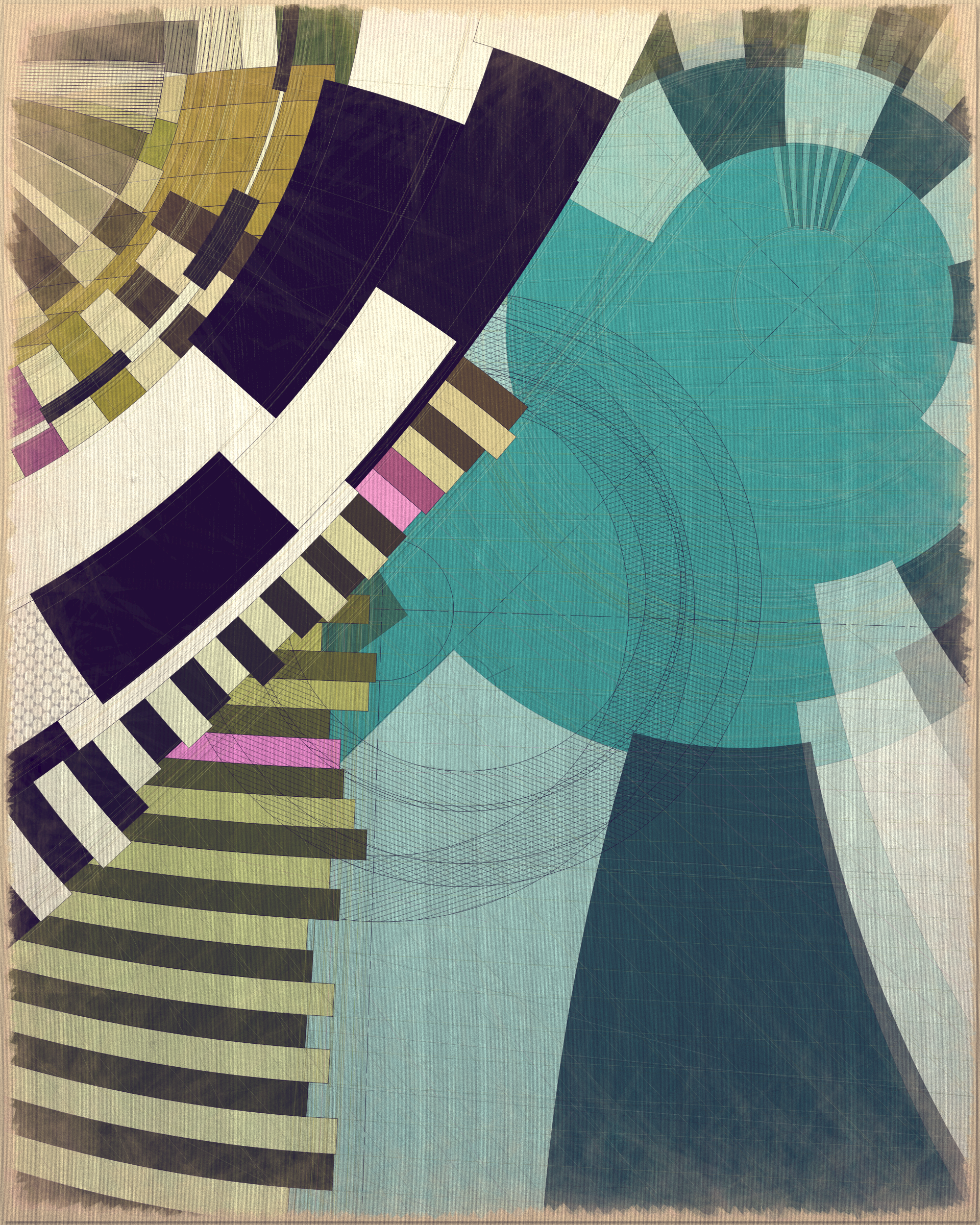 This project is a playful attempt at abstractly capturing the flowing movement of a fountain using precisely drawn elements that evoke a static and considered rendering of a subject that is in constant flux. The visual language is reminiscent of hand-draughted technical drawing, a precise and methodical practice that progresses at a radically different pace to the flowing and capricious movement of water. To increase this tension between dynamic motion and static mechanical process I wanted the surface textures to appear worn and aged like a drawing that has spent its life in the bottom of a mechanics drawer. This process of abrasion and discoloration is occurring on yet another scale of time adding complexity to the references of time passing.