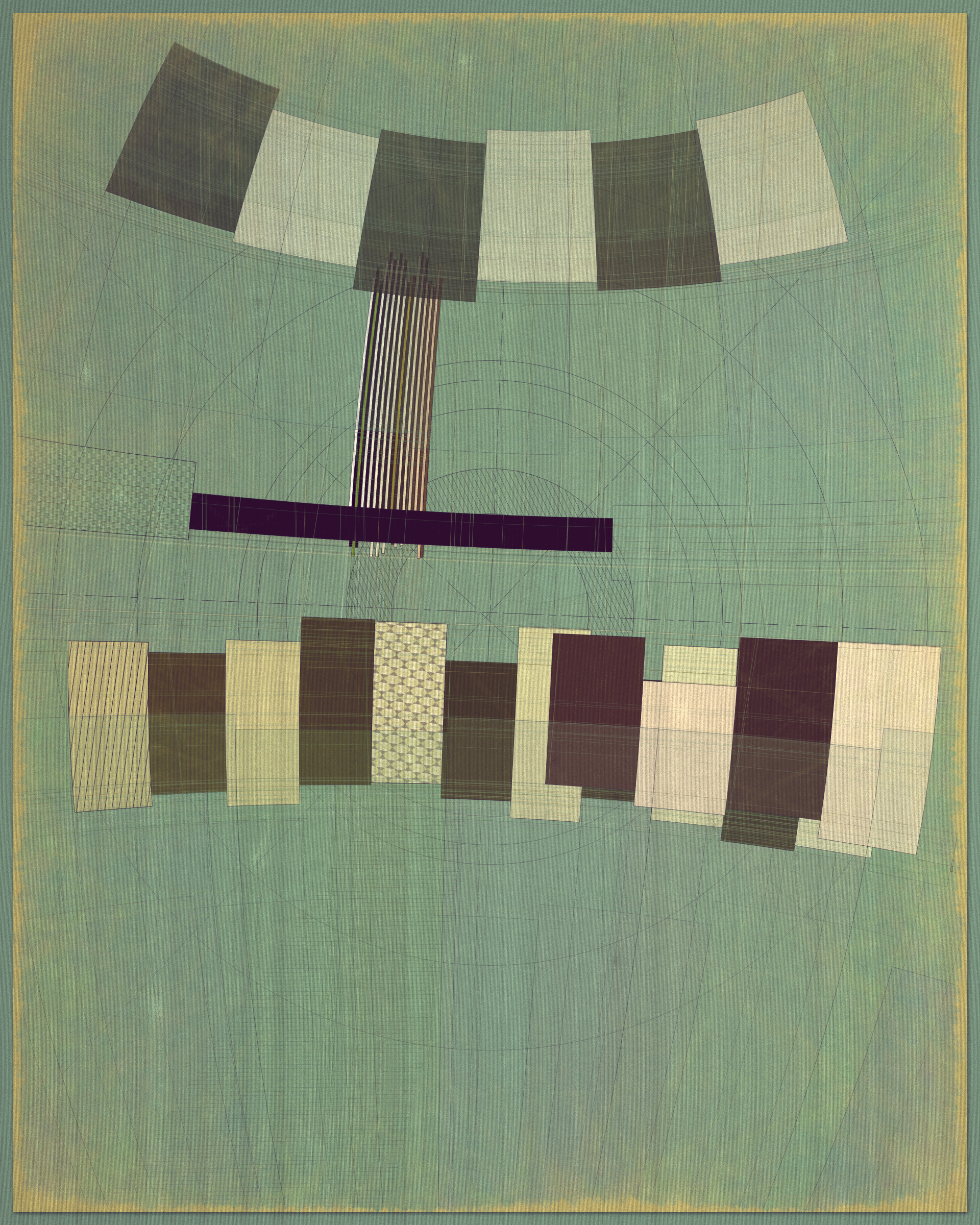 This project is a playful attempt at abstractly capturing the flowing movement of a fountain using precisely drawn elements that evoke a static and considered rendering of a subject that is in constant flux. The visual language is reminiscent of hand-draughted technical drawing, a precise and methodical practice that progresses at a radically different pace to the flowing and capricious movement of water. To increase this tension between dynamic motion and static mechanical process I wanted the surface textures to appear worn and aged like a drawing that has spent its life in the bottom of a mechanics drawer. This process of abrasion and discoloration is occurring on yet another scale of time adding complexity to the references of time passing.