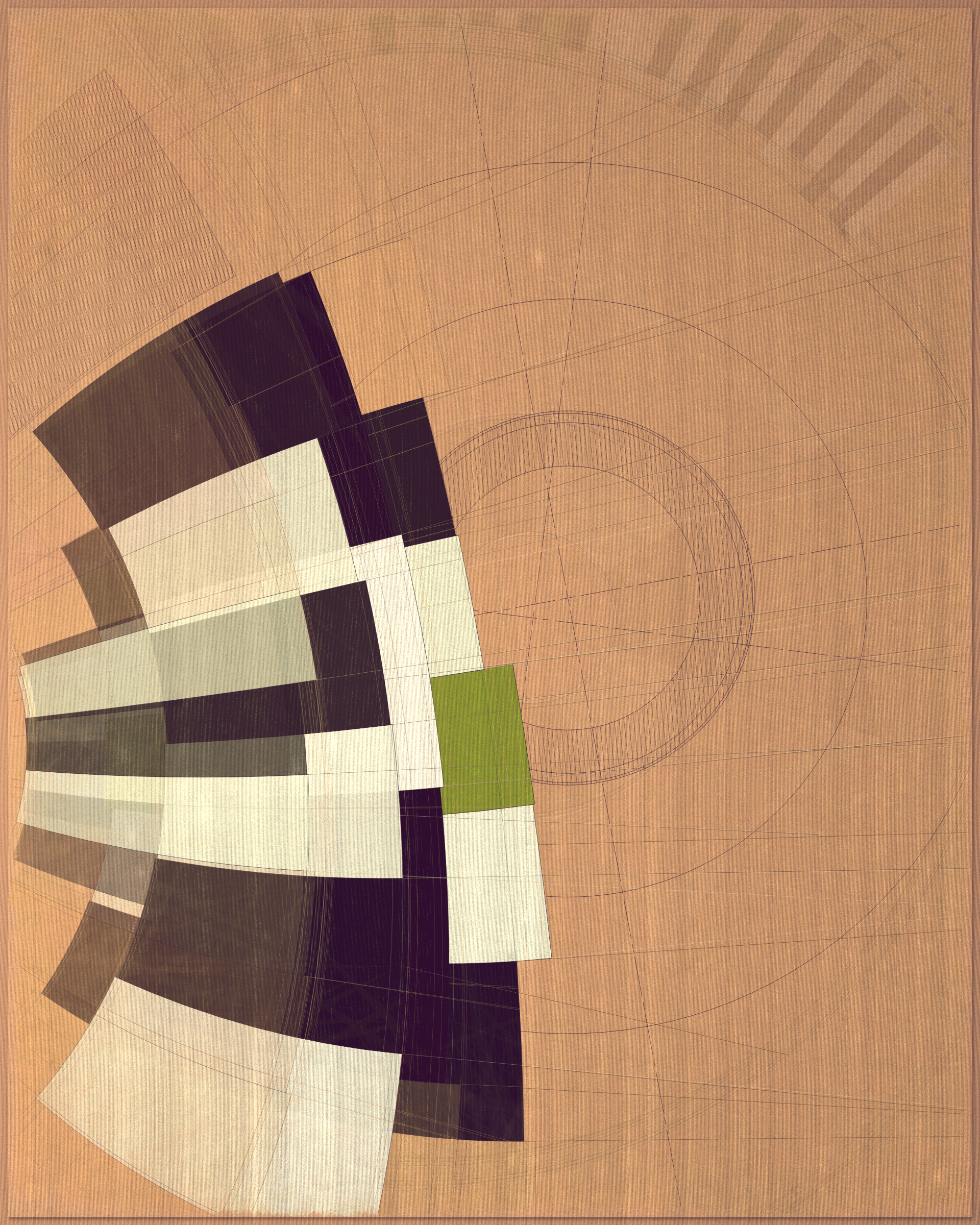 This project is a playful attempt at abstractly capturing the flowing movement of a fountain using precisely drawn elements that evoke a static and considered rendering of a subject that is in constant flux. The visual language is reminiscent of hand-draughted technical drawing, a precise and methodical practice that progresses at a radically different pace to the flowing and capricious movement of water. To increase this tension between dynamic motion and static mechanical process I wanted the surface textures to appear worn and aged like a drawing that has spent its life in the bottom of a mechanics drawer. This process of abrasion and discoloration is occurring on yet another scale of time adding complexity to the references of time passing.