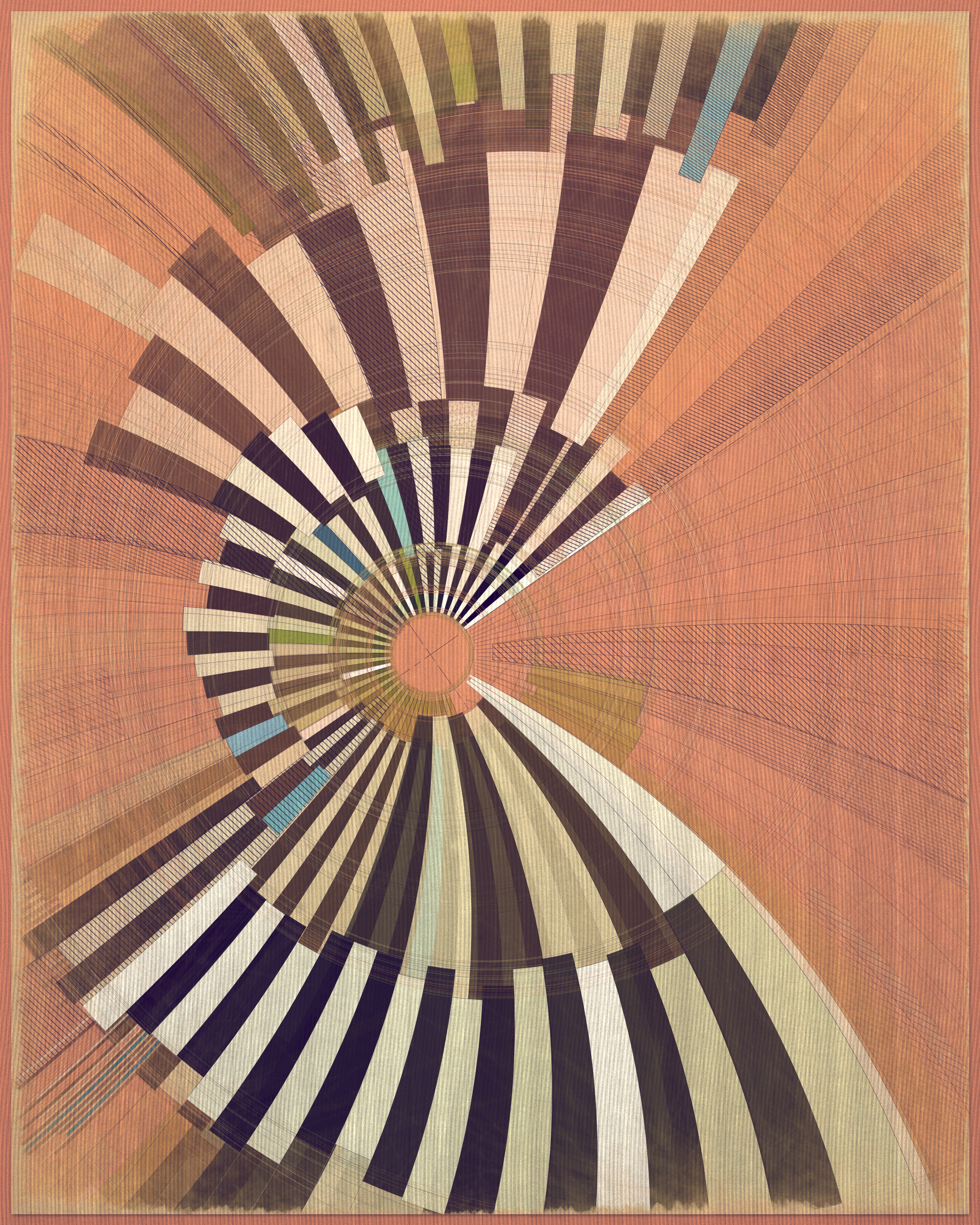 This project is a playful attempt at abstractly capturing the flowing movement of a fountain using precisely drawn elements that evoke a static and considered rendering of a subject that is in constant flux. The visual language is reminiscent of hand-draughted technical drawing, a precise and methodical practice that progresses at a radically different pace to the flowing and capricious movement of water. To increase this tension between dynamic motion and static mechanical process I wanted the surface textures to appear worn and aged like a drawing that has spent its life in the bottom of a mechanics drawer. This process of abrasion and discoloration is occurring on yet another scale of time adding complexity to the references of time passing.