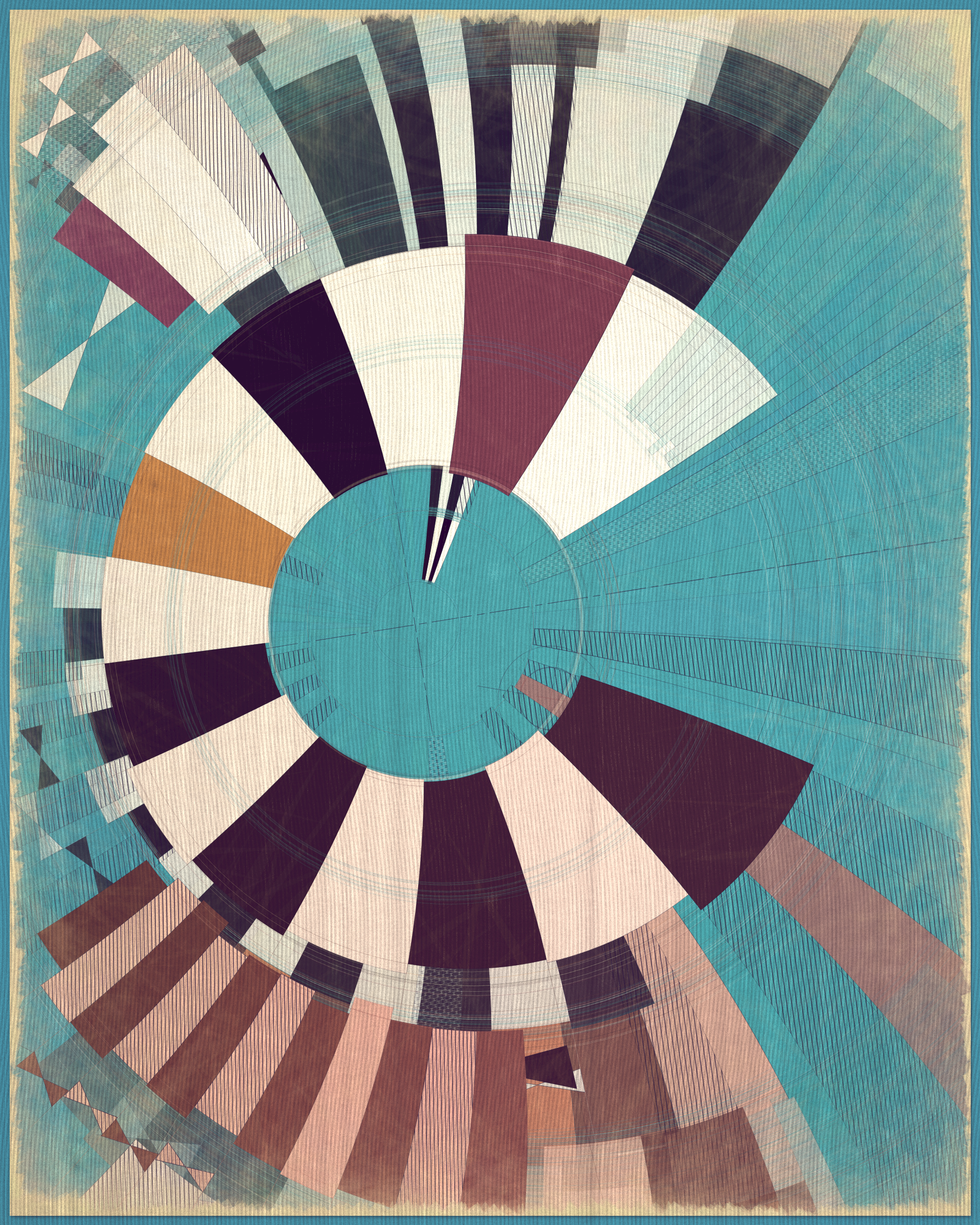 This project is a playful attempt at abstractly capturing the flowing movement of a fountain using precisely drawn elements that evoke a static and considered rendering of a subject that is in constant flux. The visual language is reminiscent of hand-draughted technical drawing, a precise and methodical practice that progresses at a radically different pace to the flowing and capricious movement of water. To increase this tension between dynamic motion and static mechanical process I wanted the surface textures to appear worn and aged like a drawing that has spent its life in the bottom of a mechanics drawer. This process of abrasion and discoloration is occurring on yet another scale of time adding complexity to the references of time passing.