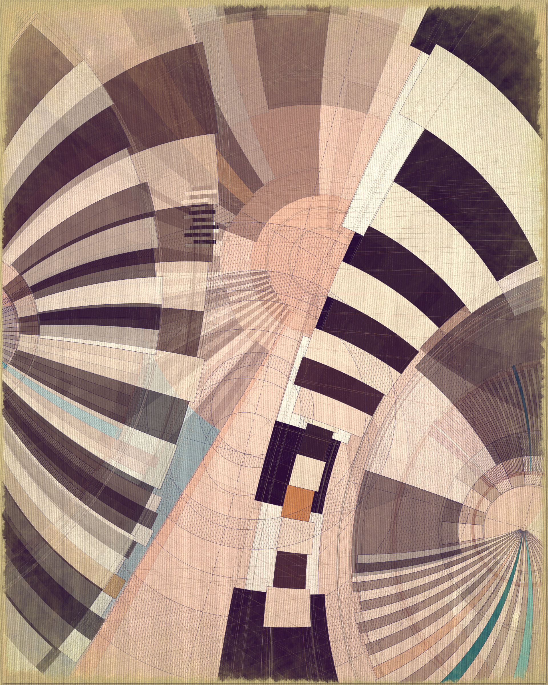 This project is a playful attempt at abstractly capturing the flowing movement of a fountain using precisely drawn elements that evoke a static and considered rendering of a subject that is in constant flux. The visual language is reminiscent of hand-draughted technical drawing, a precise and methodical practice that progresses at a radically different pace to the flowing and capricious movement of water. To increase this tension between dynamic motion and static mechanical process I wanted the surface textures to appear worn and aged like a drawing that has spent its life in the bottom of a mechanics drawer. This process of abrasion and discoloration is occurring on yet another scale of time adding complexity to the references of time passing.