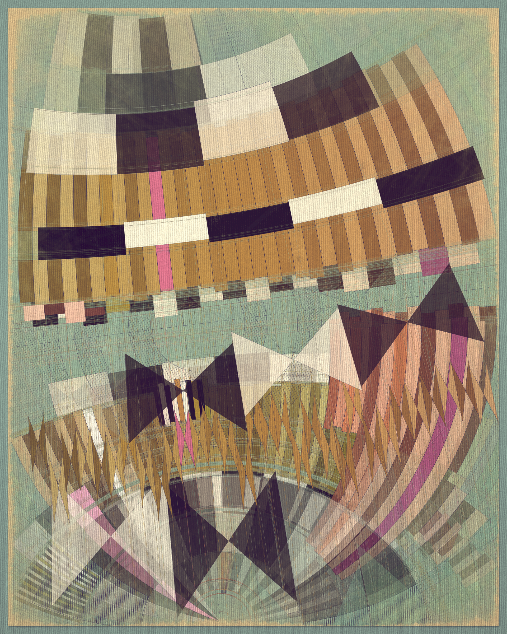 This project is a playful attempt at abstractly capturing the flowing movement of a fountain using precisely drawn elements that evoke a static and considered rendering of a subject that is in constant flux. The visual language is reminiscent of hand-draughted technical drawing, a precise and methodical practice that progresses at a radically different pace to the flowing and capricious movement of water. To increase this tension between dynamic motion and static mechanical process I wanted the surface textures to appear worn and aged like a drawing that has spent its life in the bottom of a mechanics drawer. This process of abrasion and discoloration is occurring on yet another scale of time adding complexity to the references of time passing.