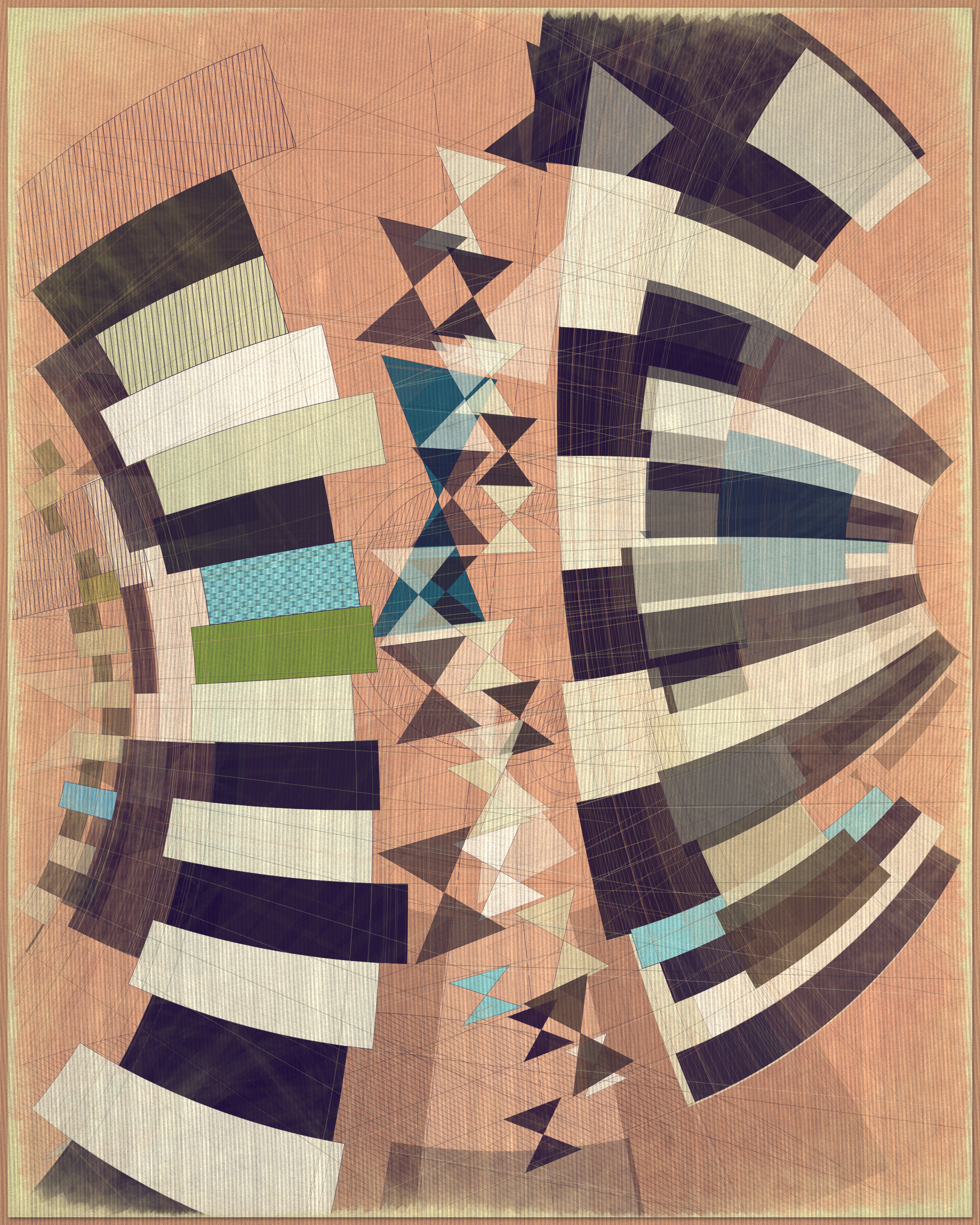 Woven into the very fabric of Fontana is a fully generative solution for creating color expression. This means there is no reliance on preset palettes with every output being an entirely unique color articulation of the color story I want the project to reveal as a whole. Far from being random I attempted to create an approach which produces colors that evoke early 20th Century art and design media. With this intention I wanted outputs to look like they could be working drawing artifacts from this period of time.