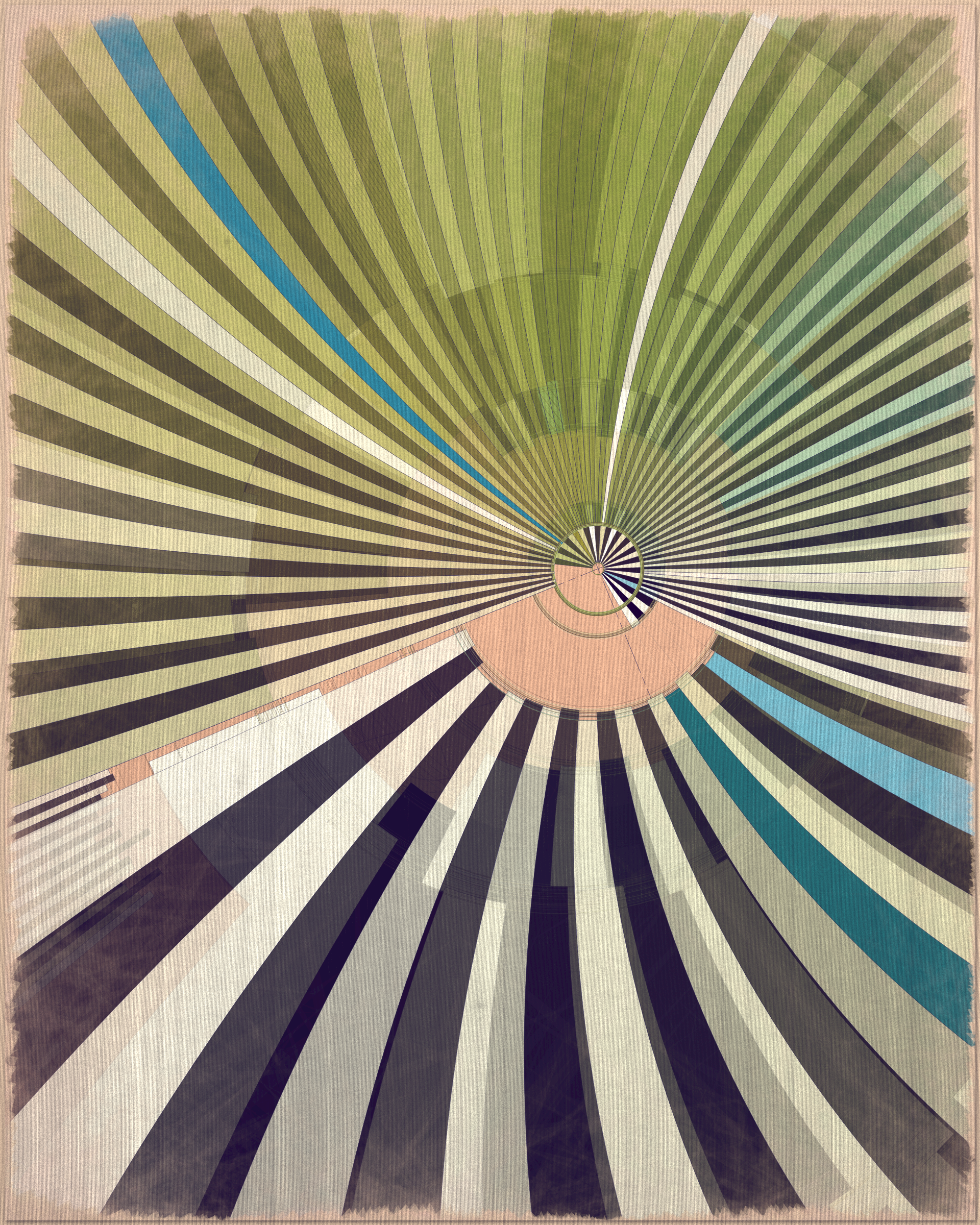 This project is a playful attempt at abstractly capturing the flowing movement of a fountain using precisely drawn elements that evoke a static and considered rendering of a subject that is in constant flux. The visual language is reminiscent of hand-draughted technical drawing, a precise and methodical practice that progresses at a radically different pace to the flowing and capricious movement of water. To increase this tension between dynamic motion and static mechanical process I wanted the surface textures to appear worn and aged like a drawing that has spent its life in the bottom of a mechanics drawer. This process of abrasion and discoloration is occurring on yet another scale of time adding complexity to the references of time passing.
