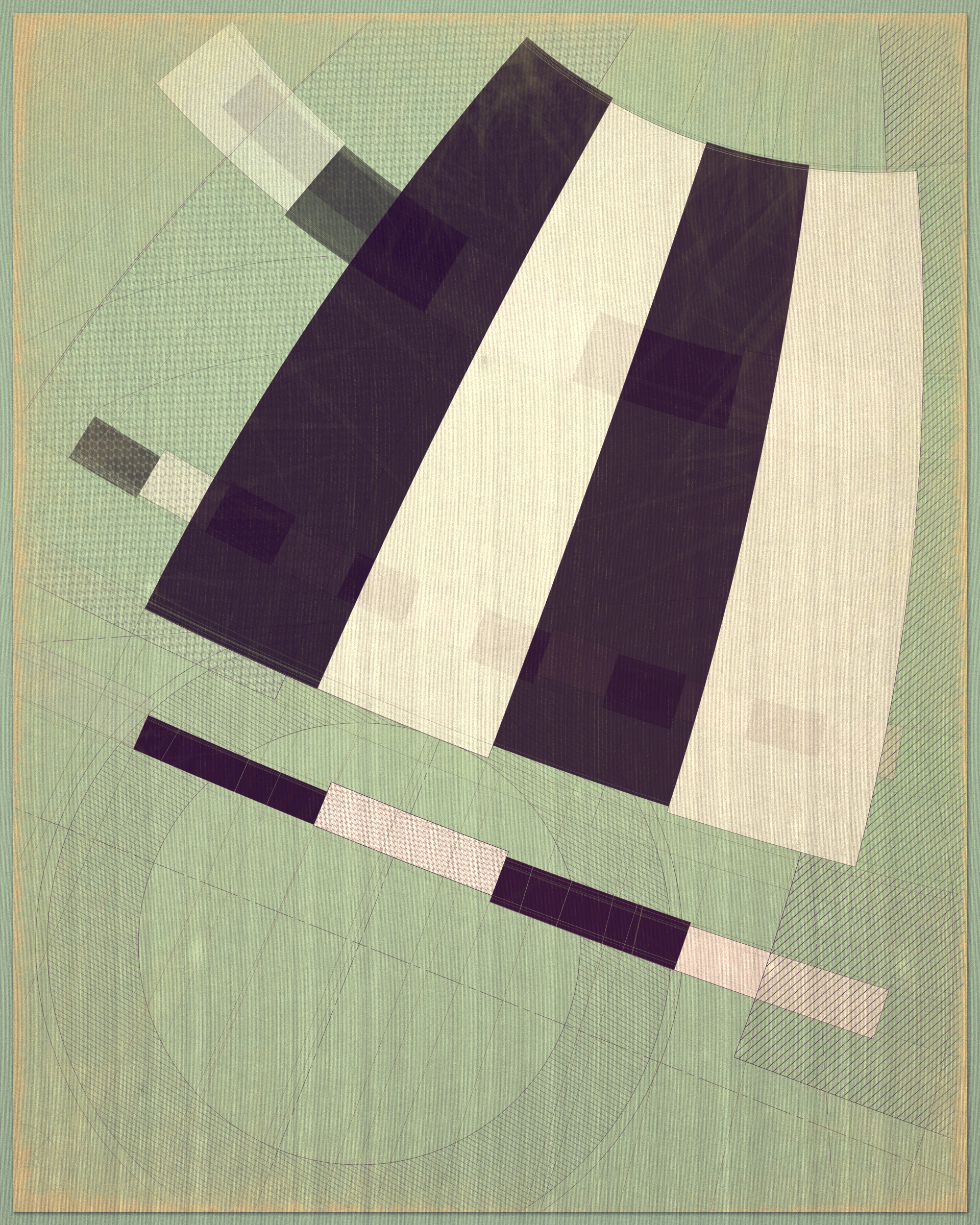 This project is a playful attempt at abstractly capturing the flowing movement of a fountain using precisely drawn elements that evoke a static and considered rendering of a subject that is in constant flux. The visual language is reminiscent of hand-draughted technical drawing, a precise and methodical practice that progresses at a radically different pace to the flowing and capricious movement of water. To increase this tension between dynamic motion and static mechanical process I wanted the surface textures to appear worn and aged like a drawing that has spent its life in the bottom of a mechanics drawer. This process of abrasion and discoloration is occurring on yet another scale of time adding complexity to the references of time passing.