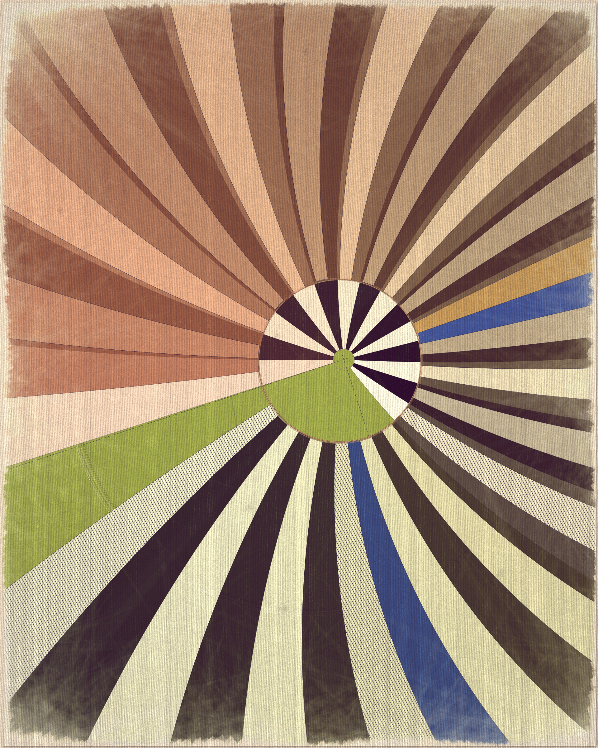 This project is a playful attempt at abstractly capturing the flowing movement of a fountain using precisely drawn elements that evoke a static and considered rendering of a subject that is in constant flux. The visual language is reminiscent of hand-draughted technical drawing, a precise and methodical practice that progresses at a radically different pace to the flowing and capricious movement of water. To increase this tension between dynamic motion and static mechanical process I wanted the surface textures to appear worn and aged like a drawing that has spent its life in the bottom of a mechanics drawer. This process of abrasion and discoloration is occurring on yet another scale of time adding complexity to the references of time passing.