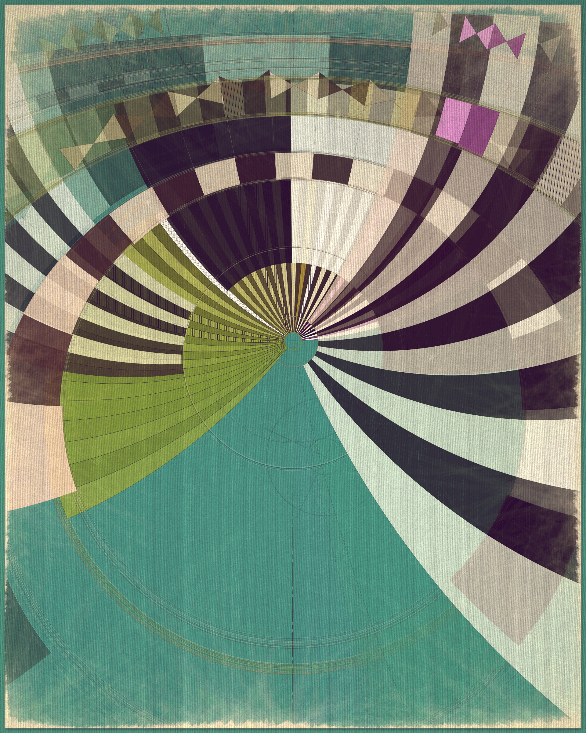 This project is a playful attempt at abstractly capturing the flowing movement of a fountain using precisely drawn elements that evoke a static and considered rendering of a subject that is in constant flux. The visual language is reminiscent of hand-draughted technical drawing, a precise and methodical practice that progresses at a radically different pace to the flowing and capricious movement of water. To increase this tension between dynamic motion and static mechanical process I wanted the surface textures to appear worn and aged like a drawing that has spent its life in the bottom of a mechanics drawer. This process of abrasion and discoloration is occurring on yet another scale of time adding complexity to the references of time passing.