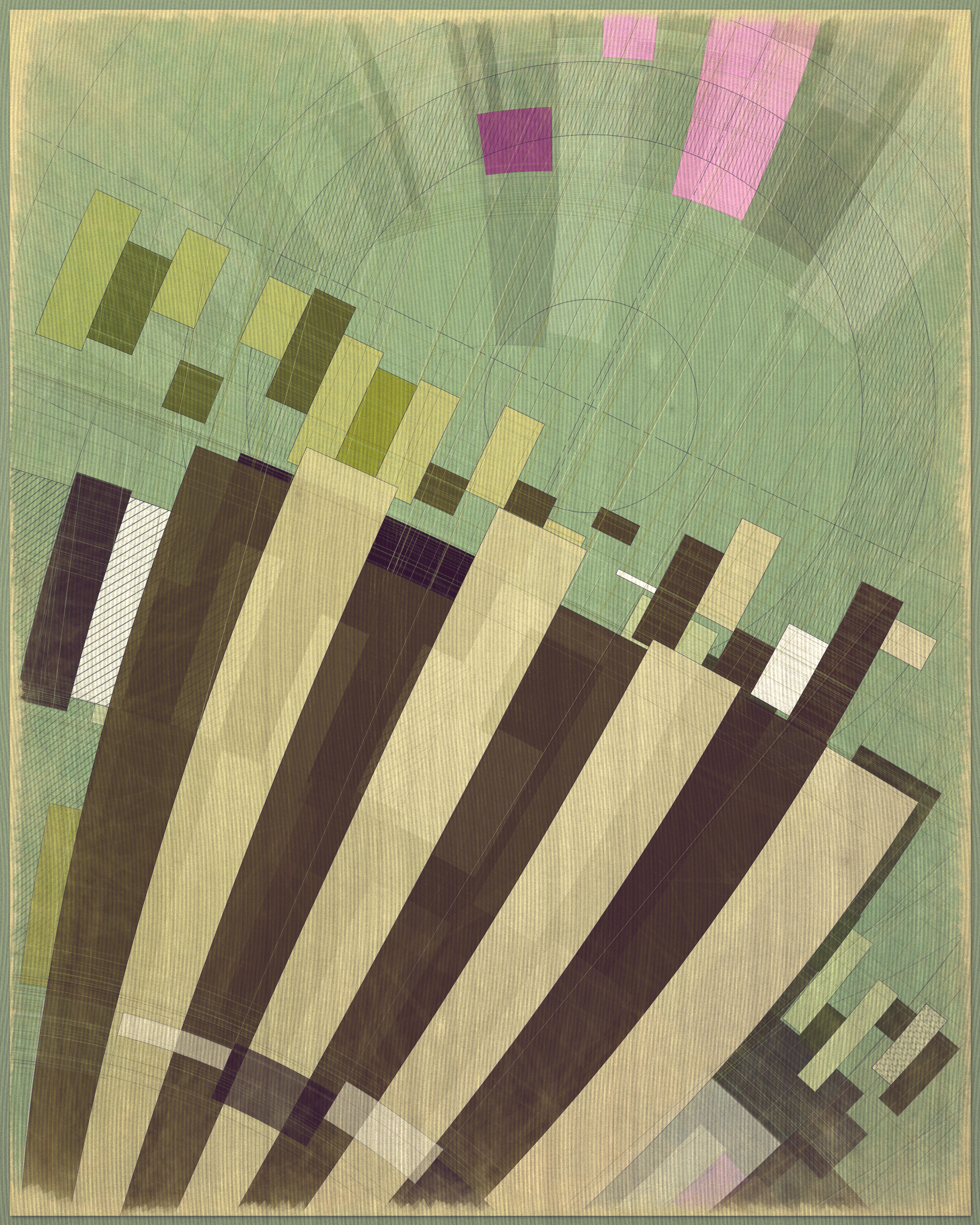 Woven into the very fabric of Fontana is a fully generative solution for creating color expression. This means there is no reliance on preset palettes with every output being an entirely unique color articulation of the color story I want the project to reveal as a whole. Far from being random I attempted to create an approach which produces colors that evoke early 20th Century art and design media. With this intention I wanted outputs to look like they could be working drawing artifacts from this period of time.