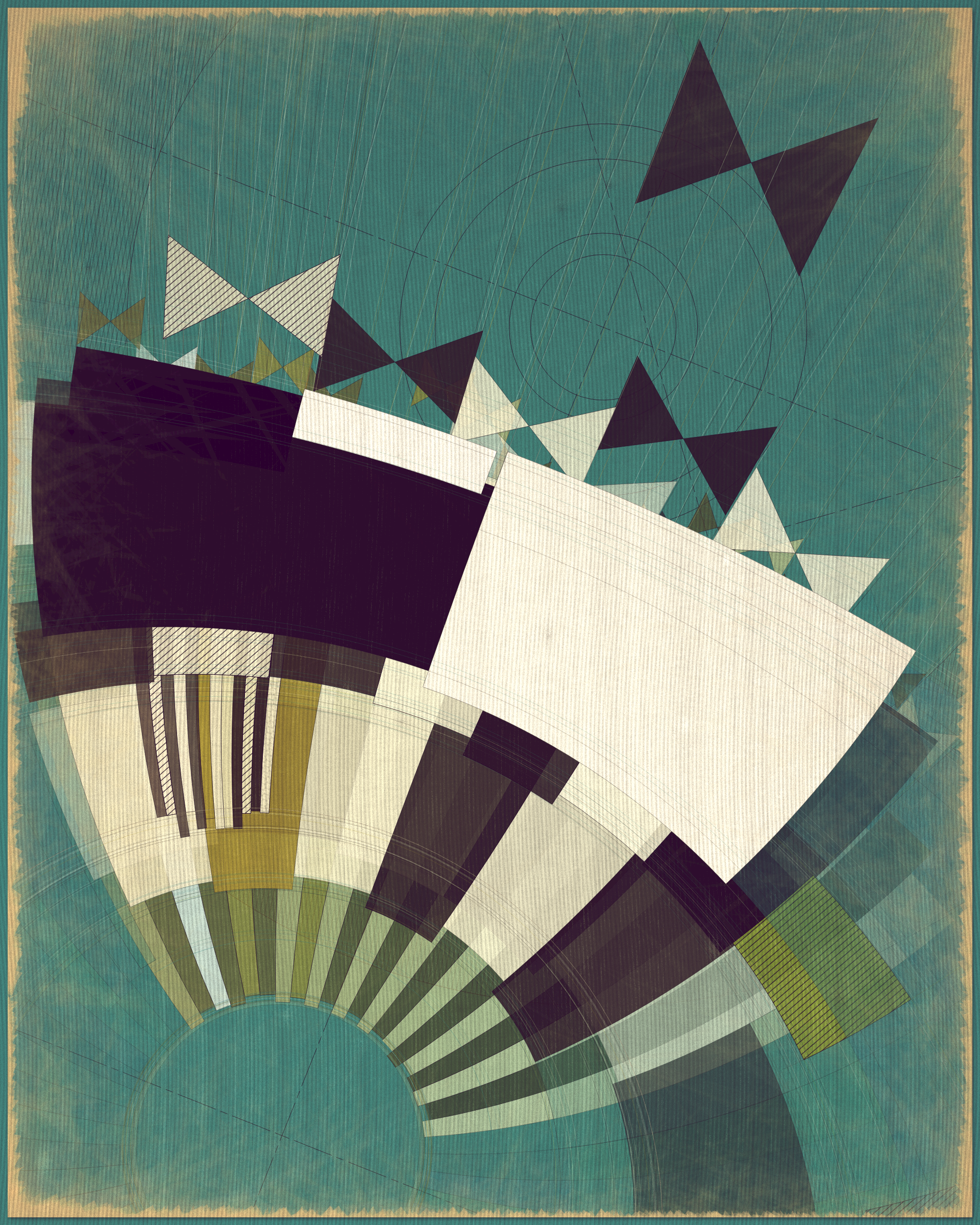 This project is a playful attempt at abstractly capturing the flowing movement of a fountain using precisely drawn elements that evoke a static and considered rendering of a subject that is in constant flux. The visual language is reminiscent of hand-draughted technical drawing, a precise and methodical practice that progresses at a radically different pace to the flowing and capricious movement of water. To increase this tension between dynamic motion and static mechanical process I wanted the surface textures to appear worn and aged like a drawing that has spent its life in the bottom of a mechanics drawer. This process of abrasion and discoloration is occurring on yet another scale of time adding complexity to the references of time passing.